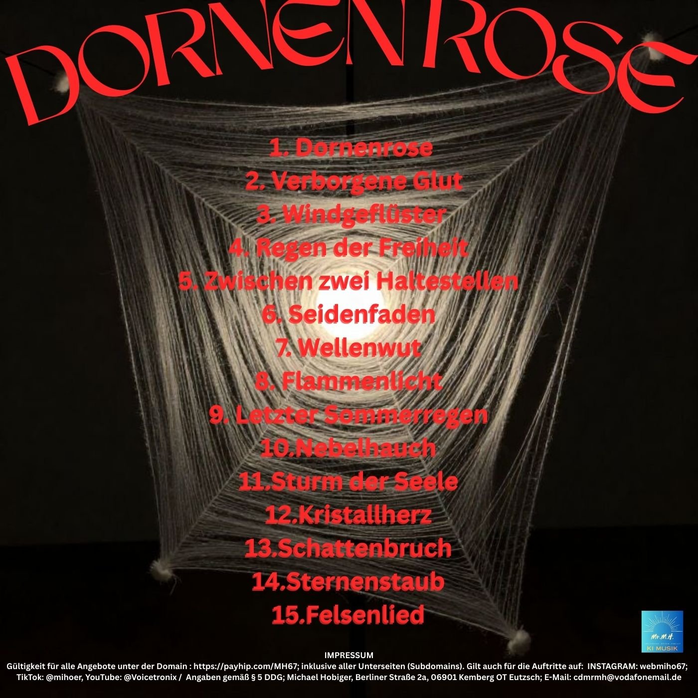 Erleben Sie mit „Dornenrose“ - Voicetronix eine einzigartige Sammlung von 15 deutschen Songs, die Sie auf eine faszinierende Reise durch Gefühle, Natur und innere Welten mitnehmen. Von poetischen Geschichten wie „Verborgene Glut“ und „Windgeflüster“ bis hin zu tiefgründigen Erlebnissen wie „Sturm der Seele“ und „Kristallherz“ bietet diese Songs eine Vielfalt an Stimmungen und Inspirationen. Ideal für alle, die deutsche Sprache und literarische Hörkunst lieben, eignet sich das Set perfekt für Entspannung, Meditation oder als kreative Begleitung im Alltag. Hochwertige Aufnahmen und ein stimmungsvolles Sounddesign machen „Dornenrose“ zu einem besonderen Hörgenuss.