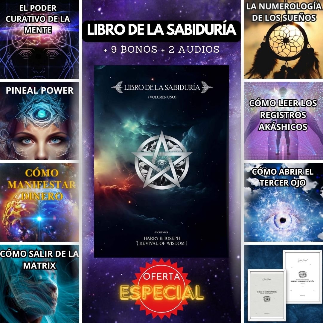 PROMOCIÓN: Sólo por tiempo limitado con tu compra del 3x1 recibes 7 libros de regalo 🎁 GRATIS. En total recibirías 10 libros incluyendo el Libro de la Sabiduría + 2 audios de frecuencia: