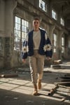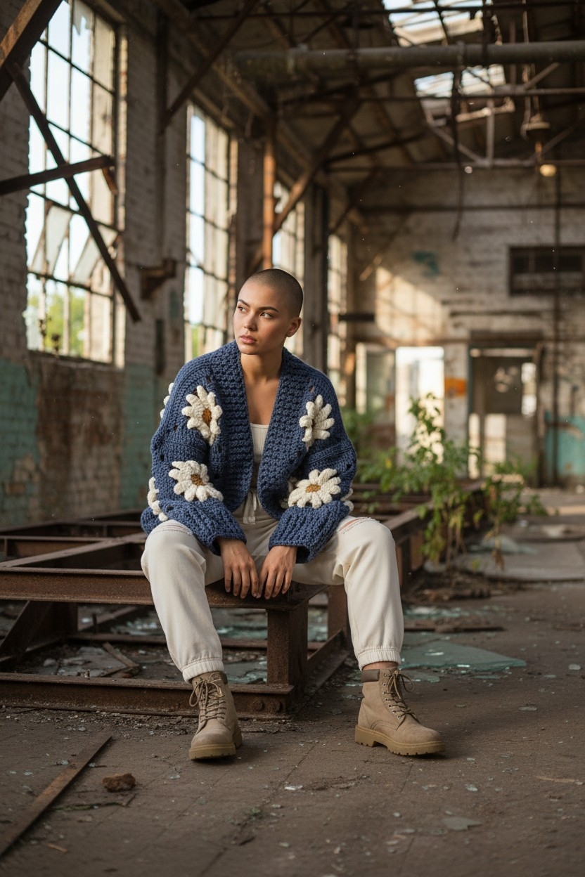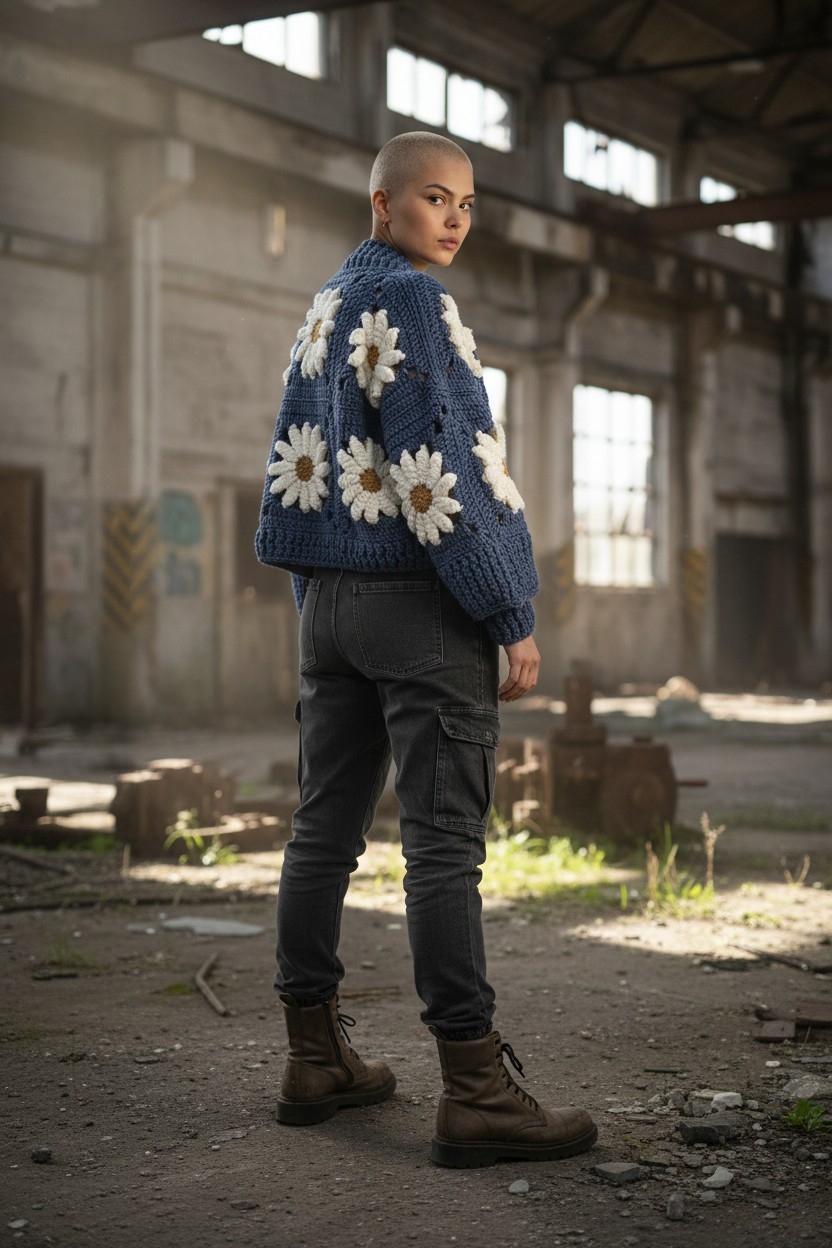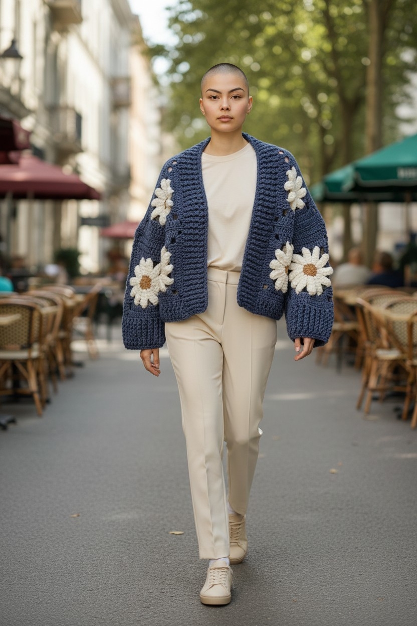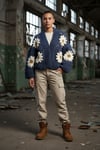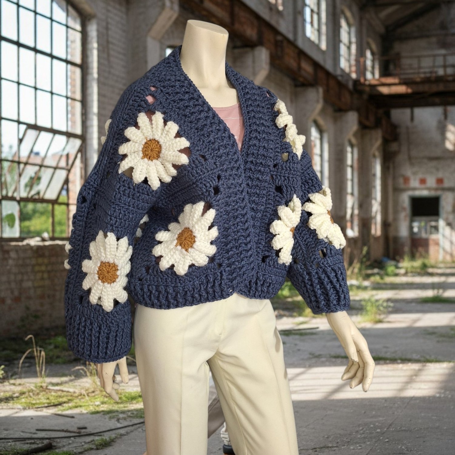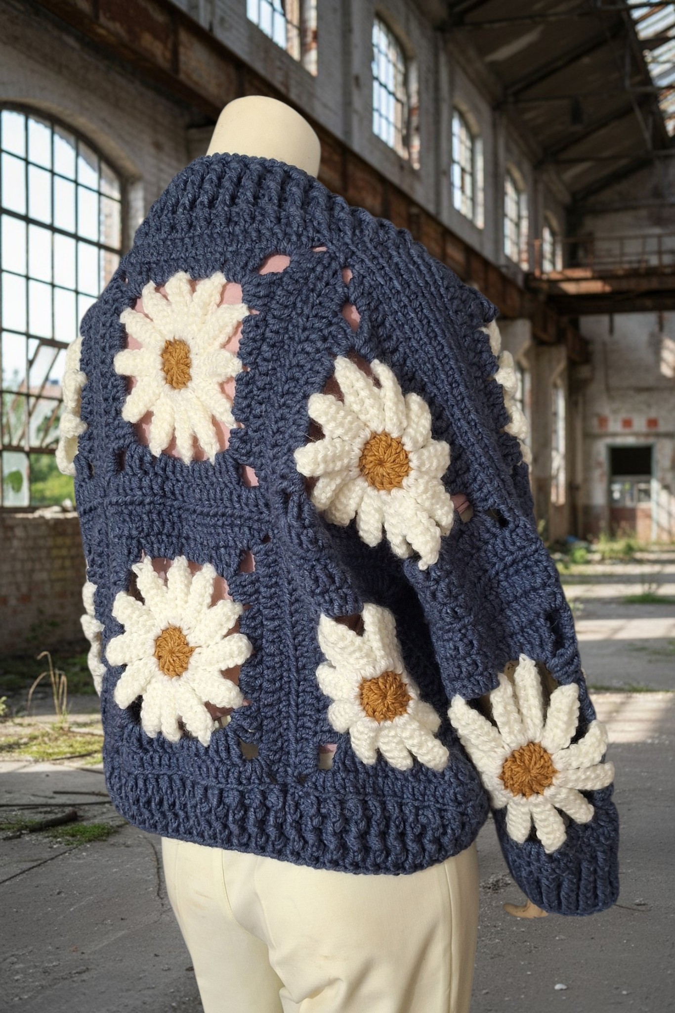 Bring a little bloom into your wardrobe with this one-of-a-kind handmade crochet cardigan. Crafted in a deep slate blue chunky yarn, this open-front jacket is built from large granny squares, each centered with a bold, dimensional daisy in cream and golden amber. The daisies are crocheted in high relief, giving the cardigan a sculptural, tactile quality that makes it truly stand out.