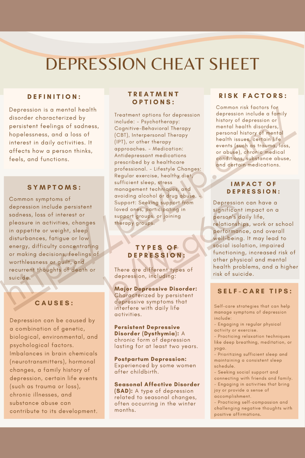 This depression cheat sheet offers an overview on depression. It provides resources to improve on a foundational understanding of depression, including different risk factors for and types of depression. This overview is meant to be used for informational purposes, and can be a helpful starting point to gain deeper understanding of depression.