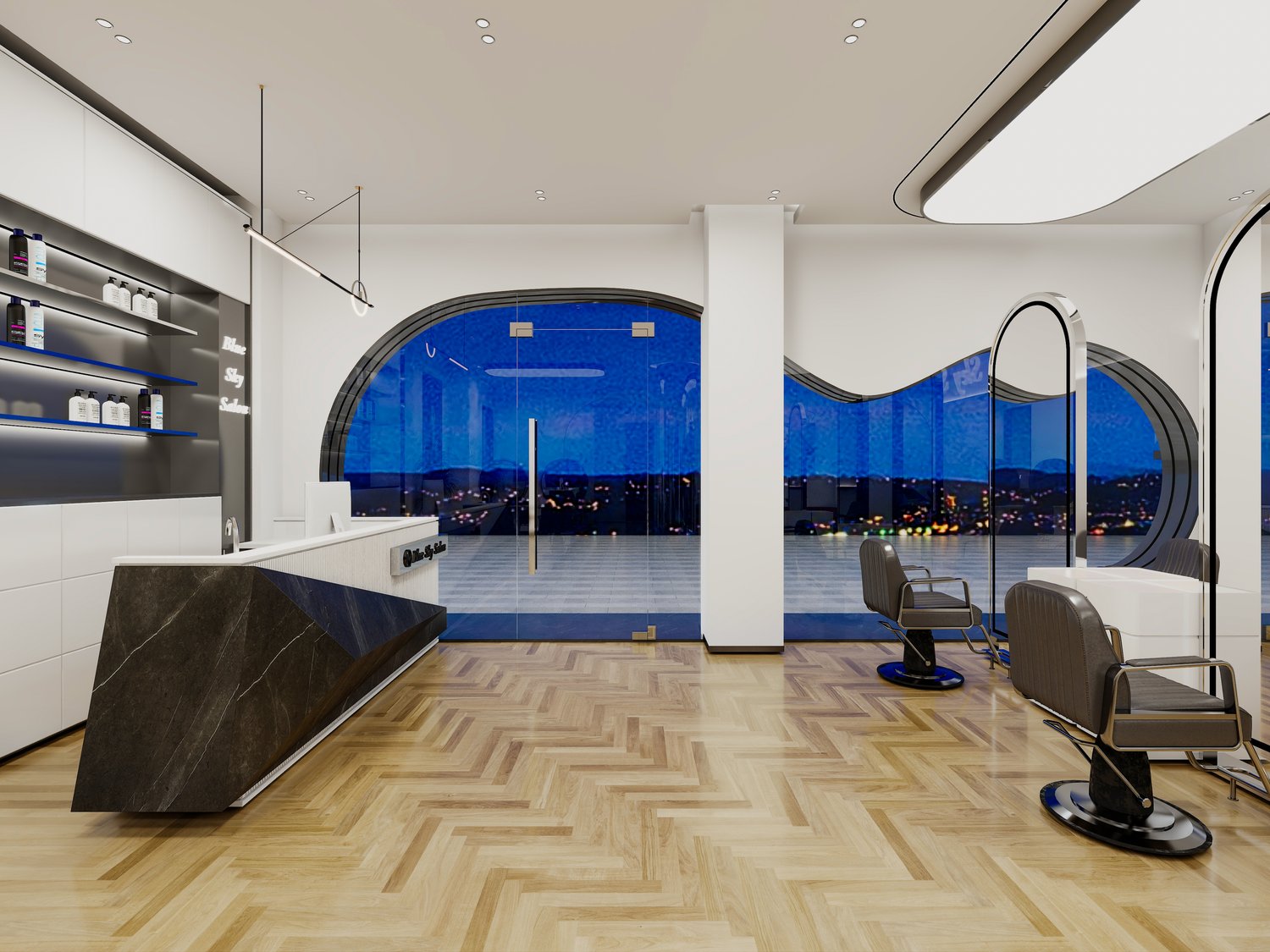 Create next-level renders with this stylish modern barber shop model. The scene features realistic lighting, furniture, and textures ideal for 3d Beauty salon visualizations or architectural projects.