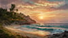 Frame TV Art painting of a seascape at sunset. The scene is depicted from the perspective of a viewer standing on a beach, looking out towards the ocean. The sun is setting behind a rocky cliff face, casting a warm orange and yellow glow across the sky. 16.9 displays