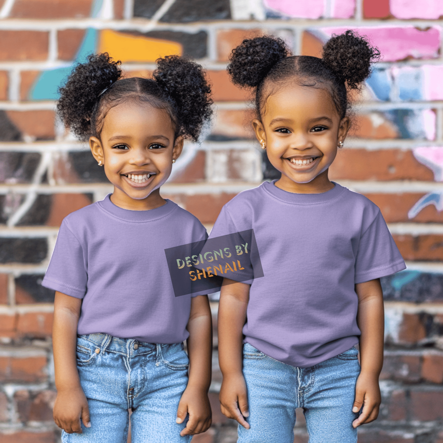 This adorable mockup features two smiling African American twin toddler girls wearing soft purple t-shirts and jeans. Perfect for showcasing your kids' SVGs, sublimation, DTF, or printable designs! Set against a colorful graffiti brick wall, this vibrant and modern mockup brings your designs to life.