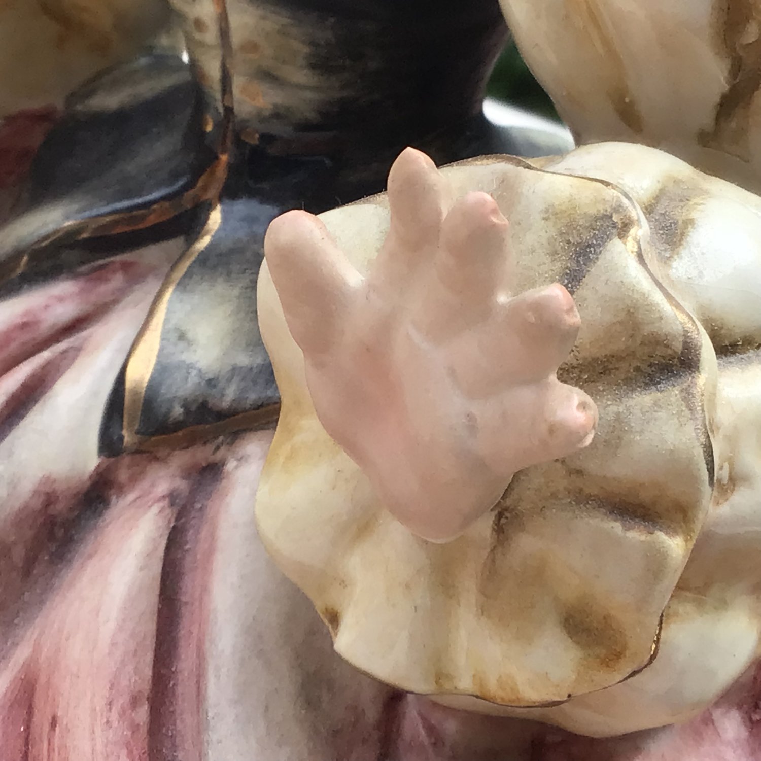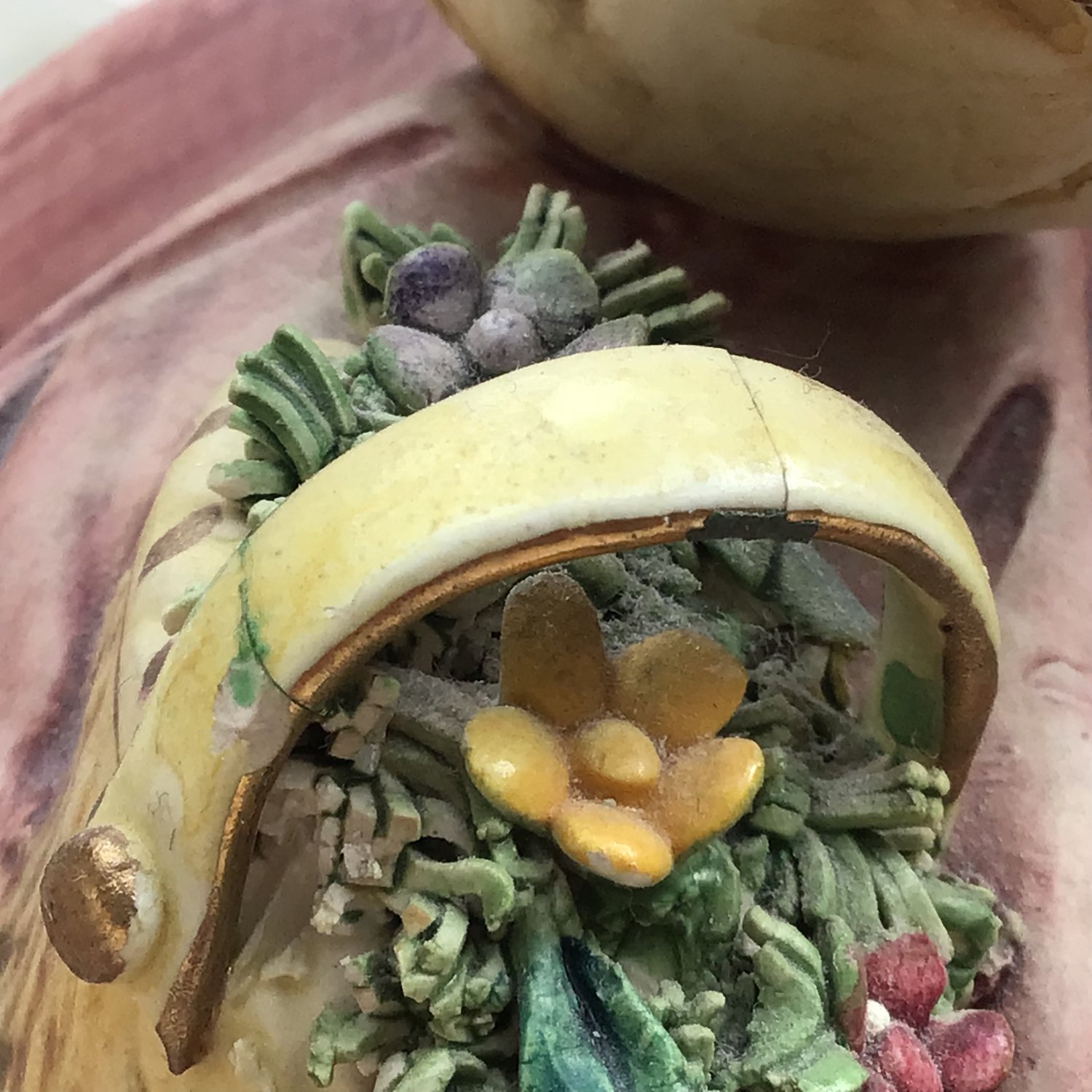 A mid century capodimonte style porcelain figurine, signed 'G Made in Italy', possibly by Tiziano Galli. 10.5 ins. Handle of basket re-glued and minor losses to hair and fingers.. c1950-80.