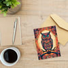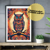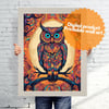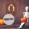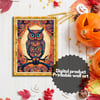 A digital file for printing; Funny animal at halloween night. Horror owl witch animal blue eyes poster printable invitation card and wallpaper for phones