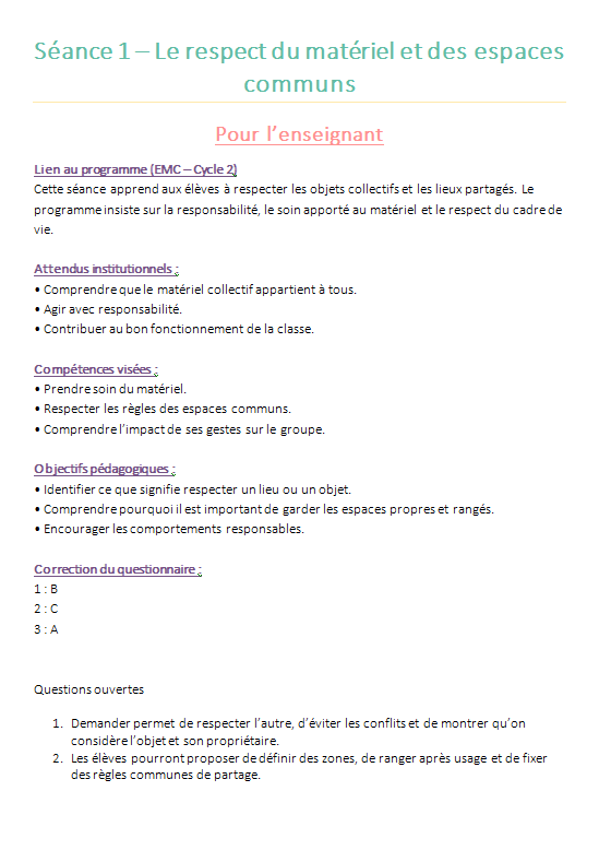 Cette sĂ©quence complĂšte de 5 sĂ©ances EVAR pour le Cycle 2 vous permet de travailler, de façon trĂšs concrĂšte, tout ce qui construit une classe apaisĂ©e : respect du matĂ©riel et des espaces communs, respect du corps, droit de dire âstopâ, importance des rĂšgles pour jouer, et respect des diffĂ©rences.