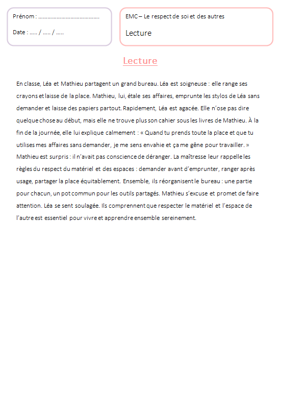 - EMC (Cycle 2) : respect dâautrui, rĂšgles communes, responsabilitĂ©
