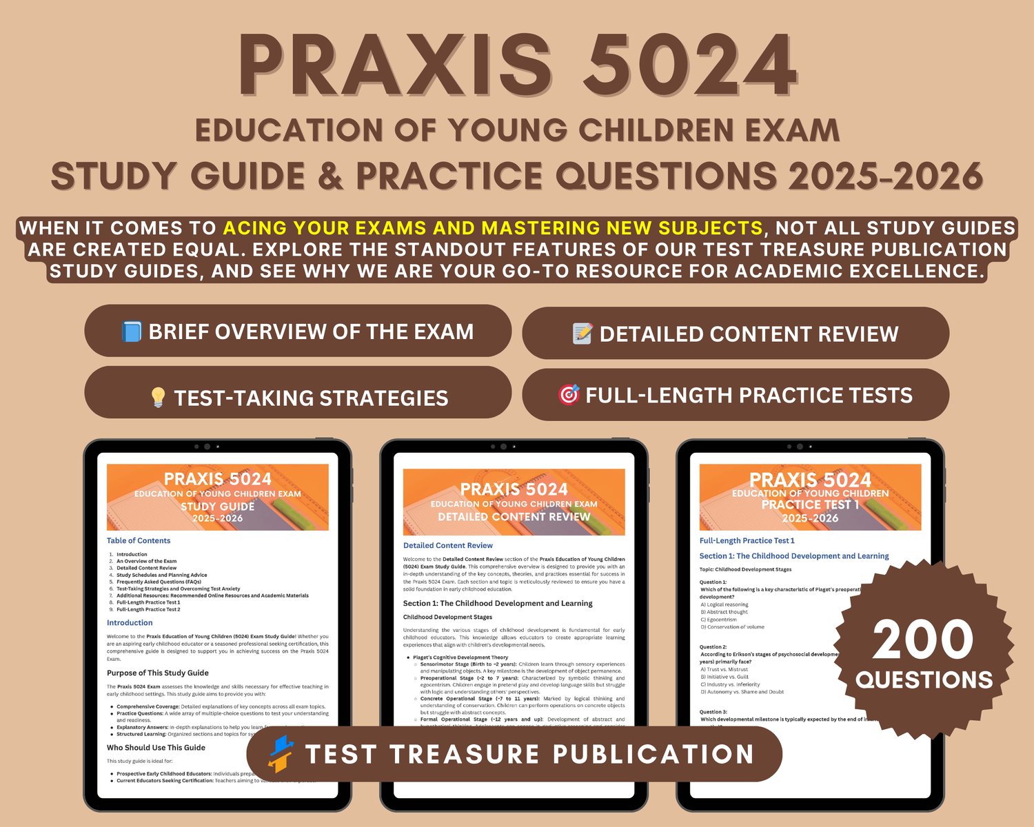 Ace the Praxis Education of Young Children (5024) Exam with confidence using "Praxis Education of Young Children (5024) Exam Study Guide 2025-2026" by Test Treasure Publication. This comprehensive guide is meticulously designed to help you master every aspect of the exam and achieve your certification goals.