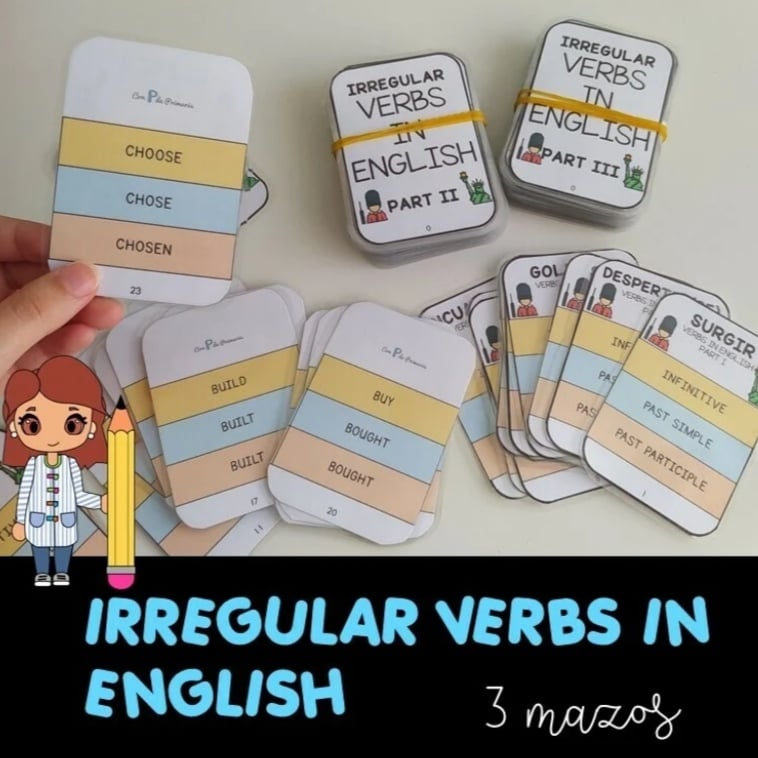 3 barajas de cartas de doble cara con las conjugaciones de los145 verbos irregulares en inglés. Se da el verbo en español, y por detrás aparece el infinitivo, el pasado simple y el participio.