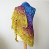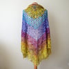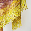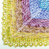 Start the Full Fade Hap at one corner of the center square and increase until big enough, then decrease. Pick up stitches along the edges, and work the stunning border outwards. Each color band in its own lace patterning. The shawl is finished with a gorgeous edging that is knitted on sideways and attached to the live stitches of the border as it is being worked.