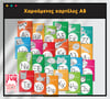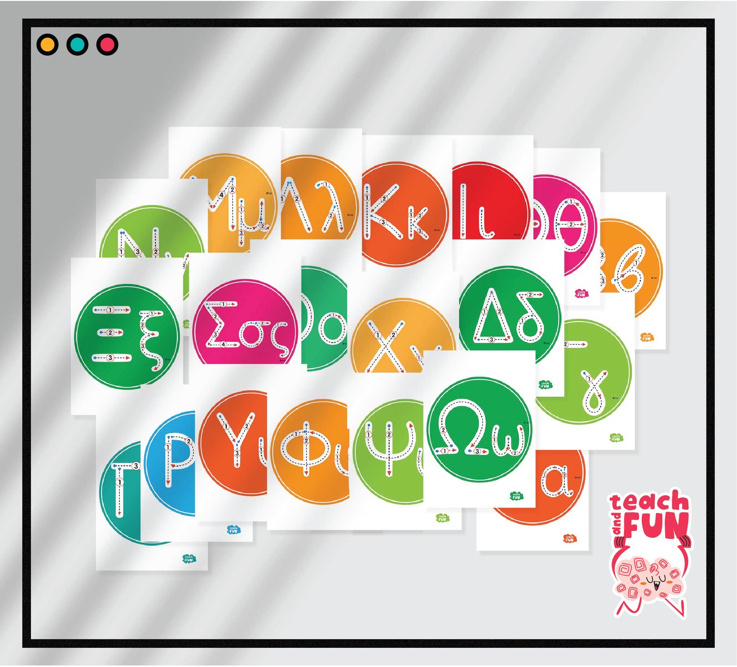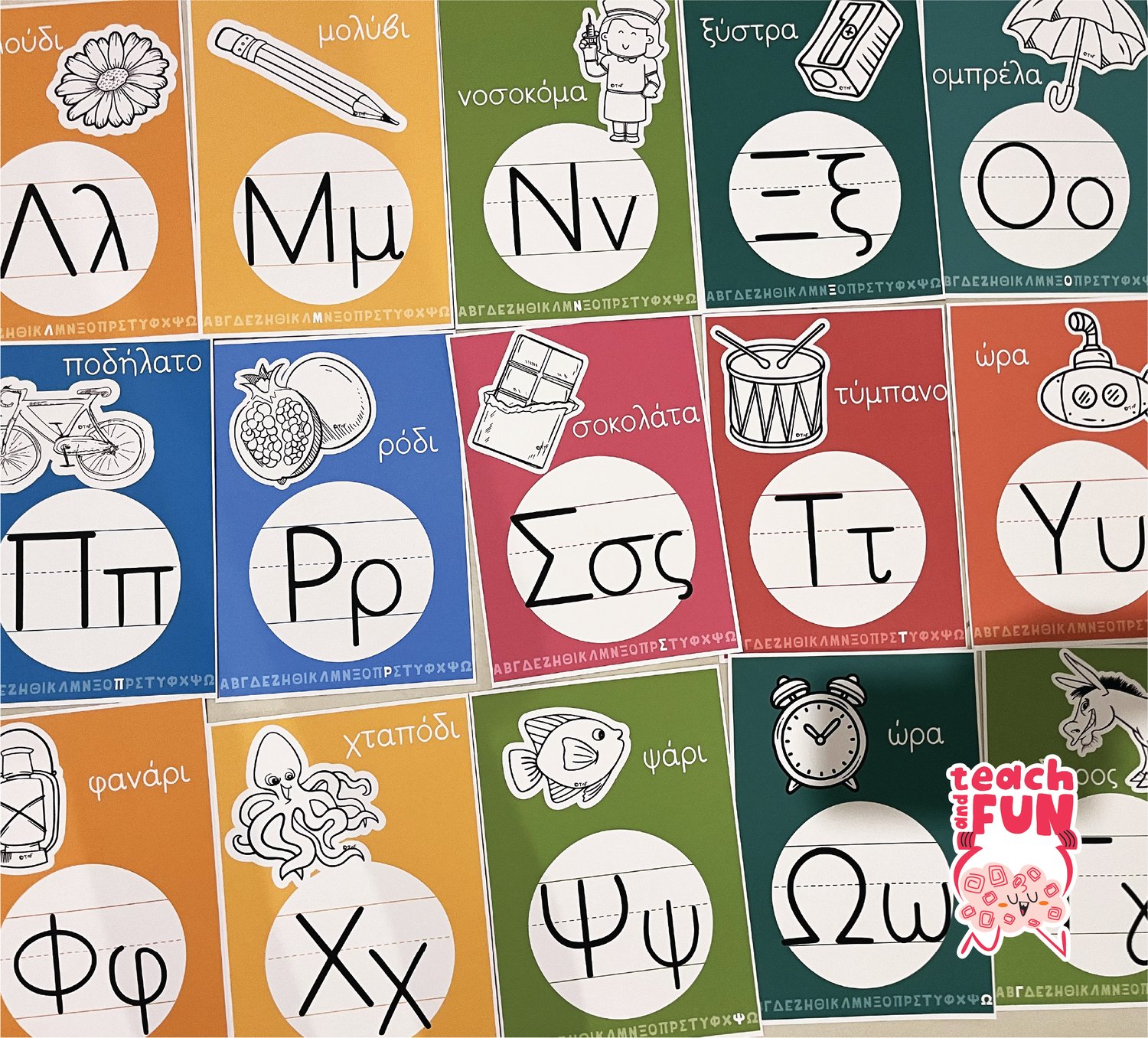 Χαρούμενες καρτέλες για τον πίνακα και για το θρανίο, σε όμορφο, παιχνιδιάρικο ύφος σε δύο εκδοχές! Στρογγυλές με φορά γραφής για κάθε γράμμα και σε στυλ αφίσας!