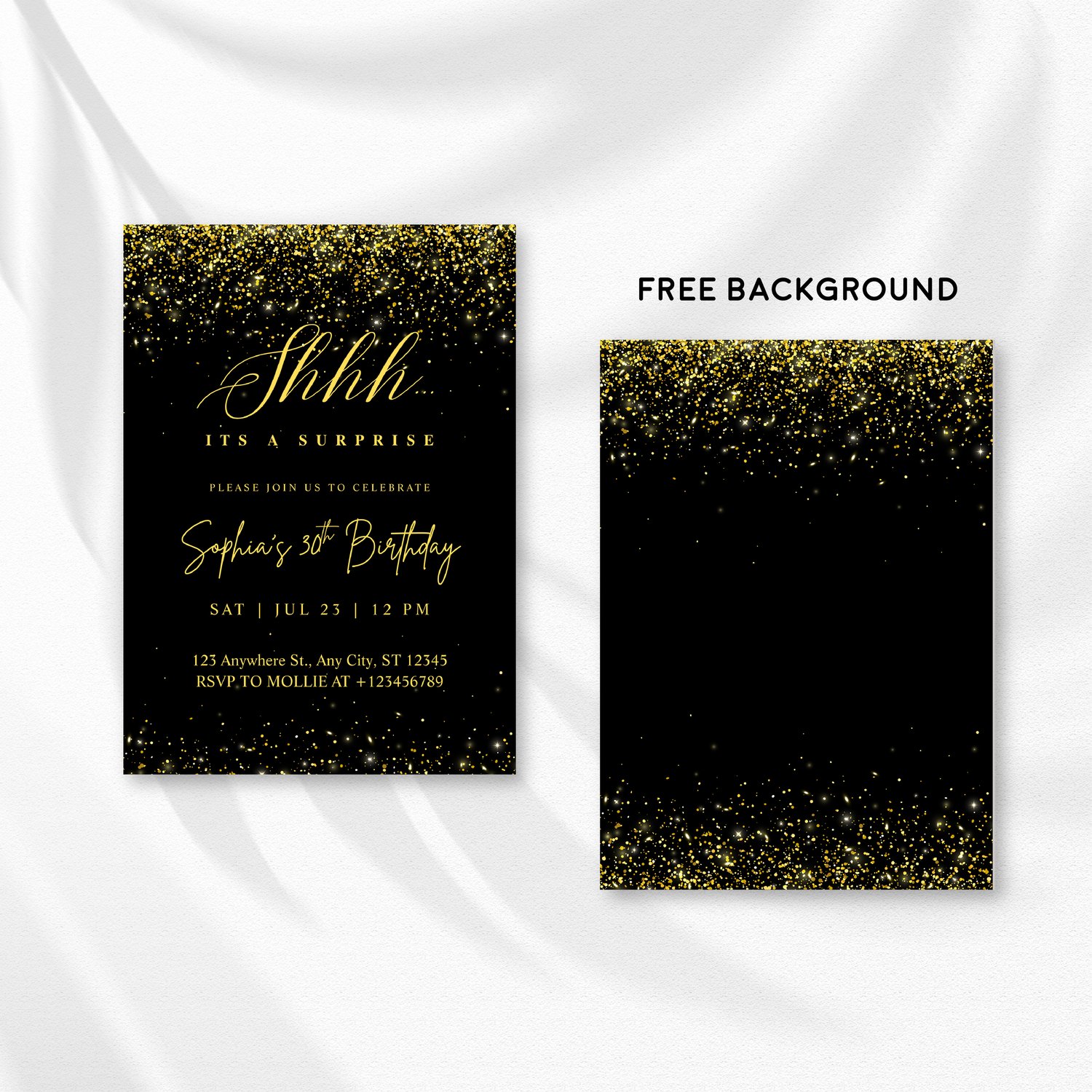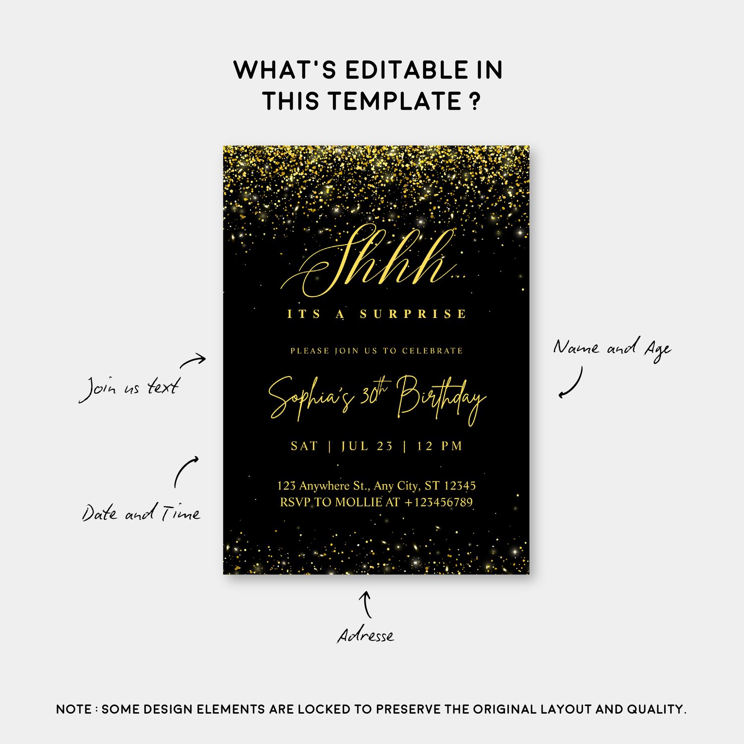 Luxury Black & Gold Surprise Birthday Invitation – Instant Download Canva Template