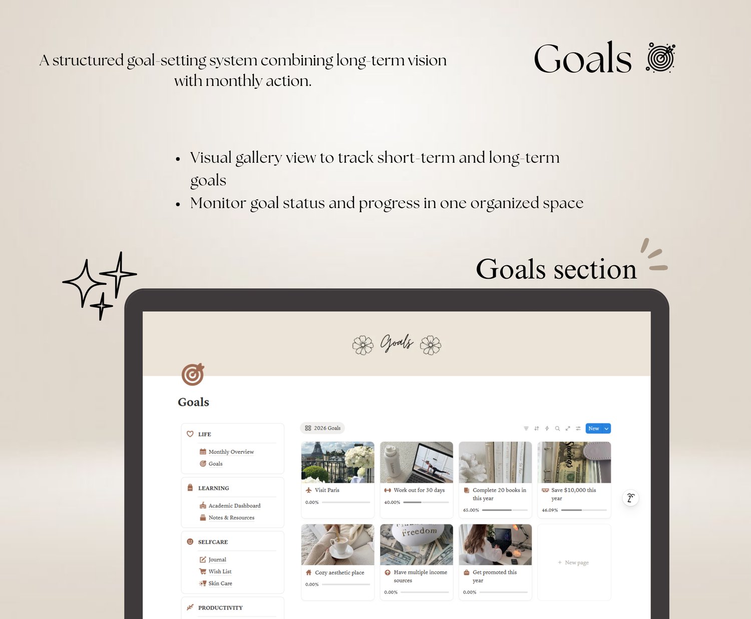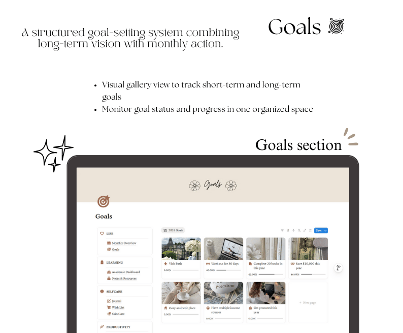 - Goals section to define and track what truly matters