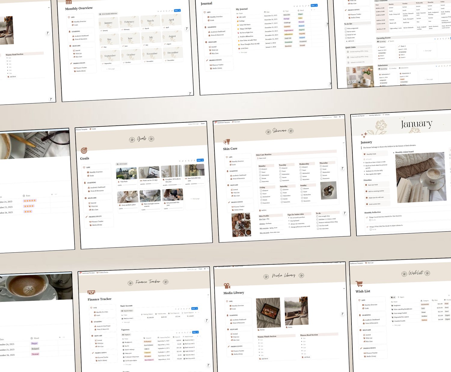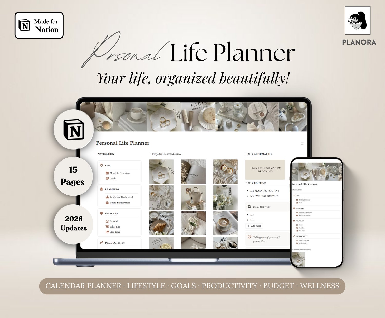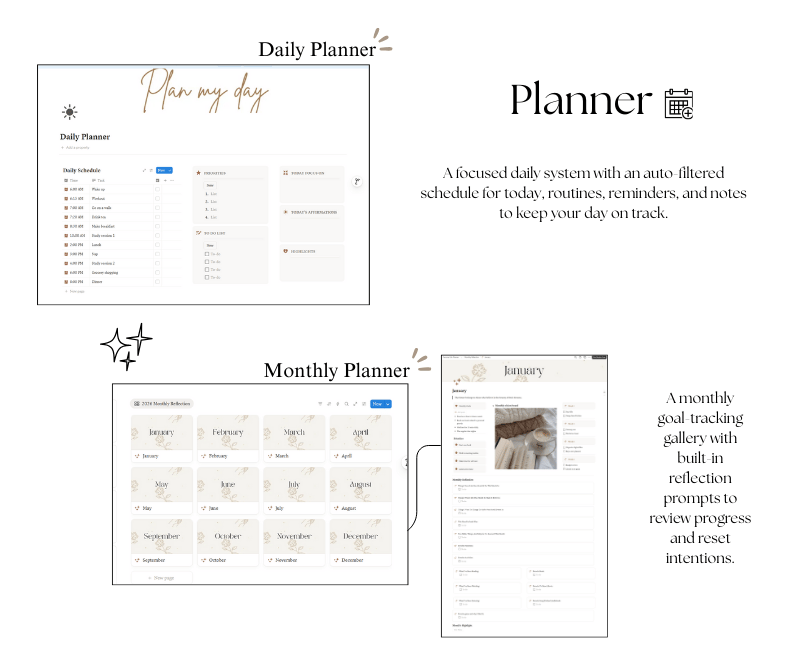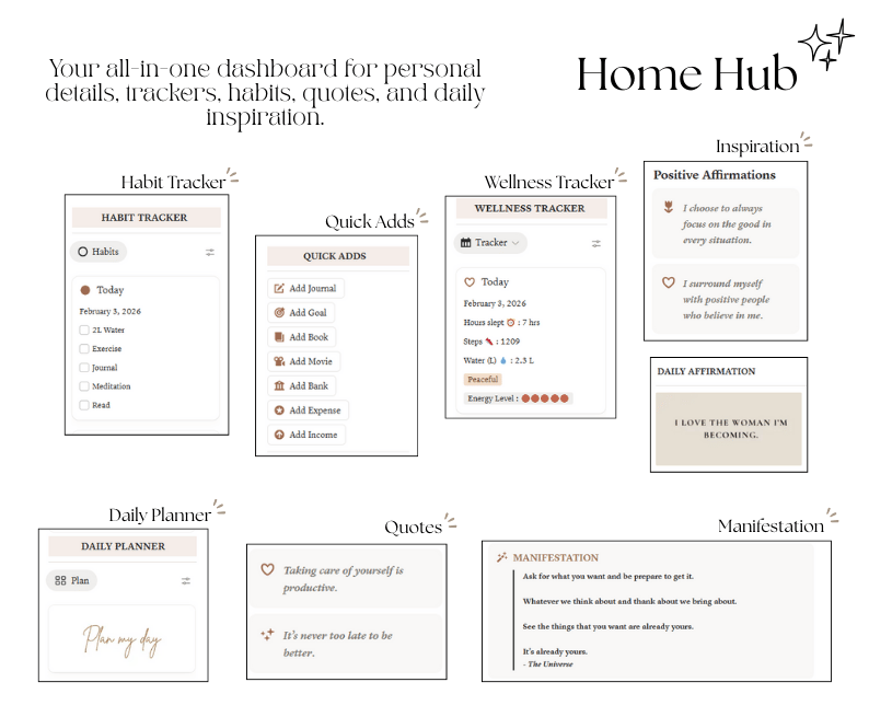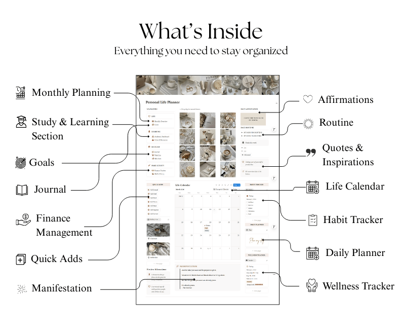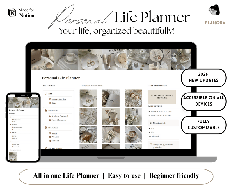 The Personal Life Planner is a thoughtfully designed Notion template created to help you bring clarity, balance, and consistency into your daily life. It combines planning, self-care, productivity, and wellness tracking into one cohesive system—so you can stop feeling scattered and start living with intention.