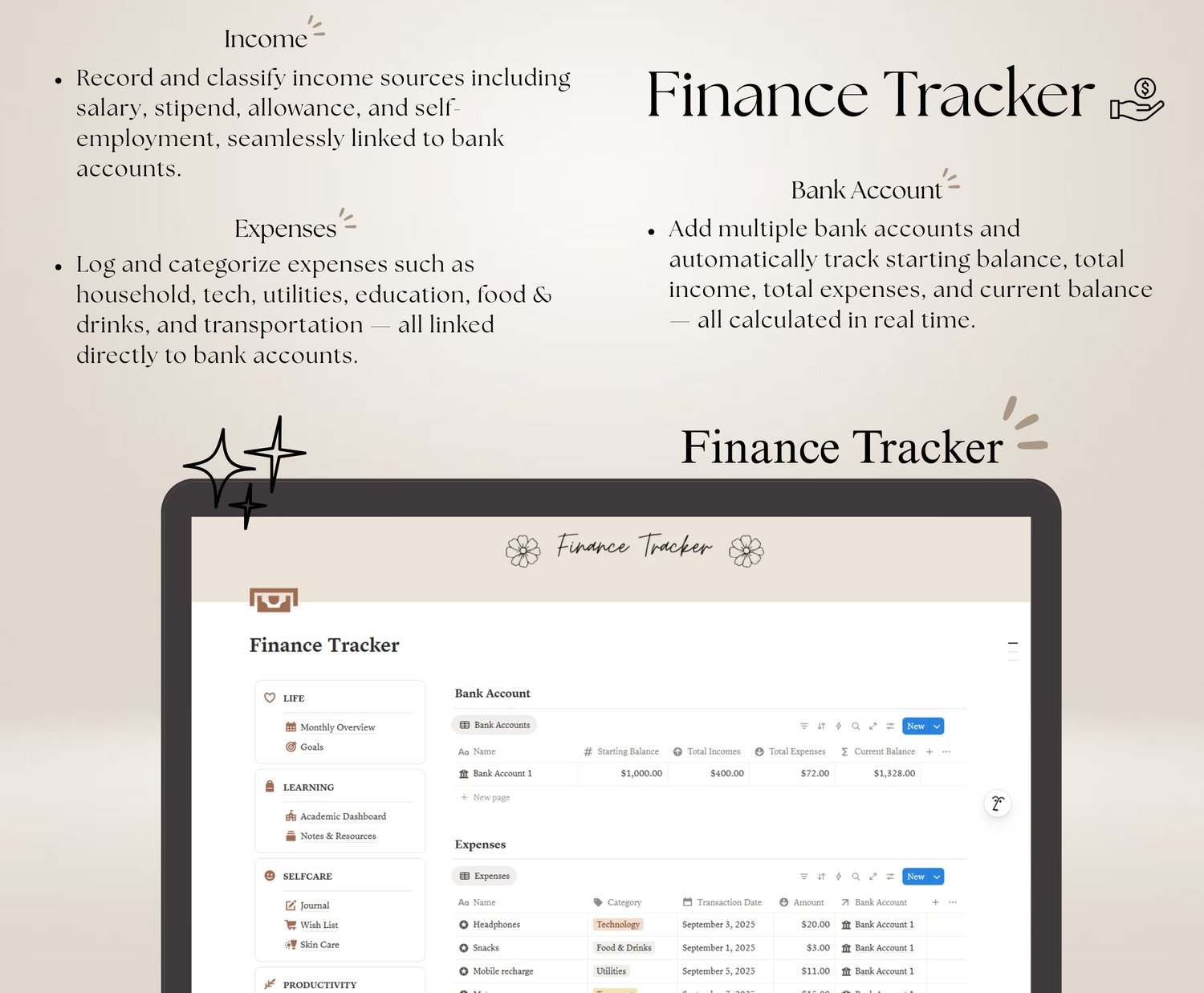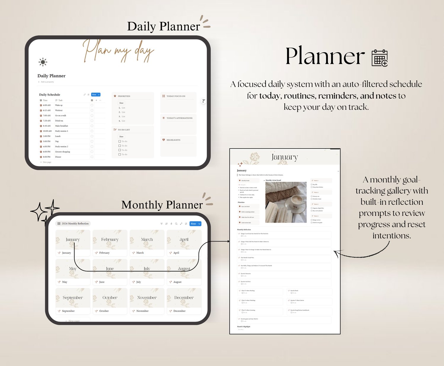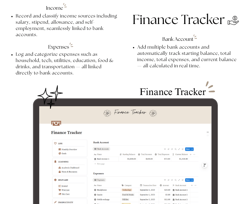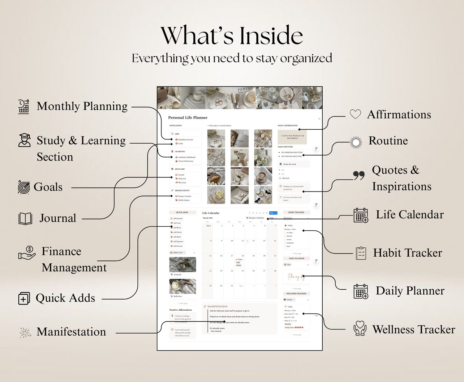 The Personal Life Planner is a thoughtfully designed Notion template created to help you bring clarity, balance, and consistency into your daily life. It combines planning, self-care, productivity, and wellness tracking into one cohesive system—so you can stop feeling scattered and start living with intention.