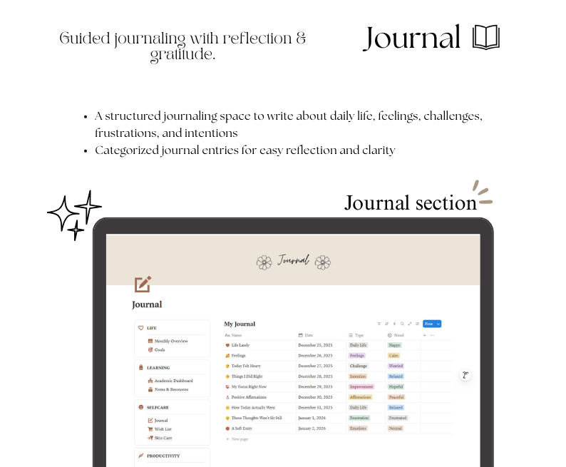 - Manifestation section to align your thoughts with your goals