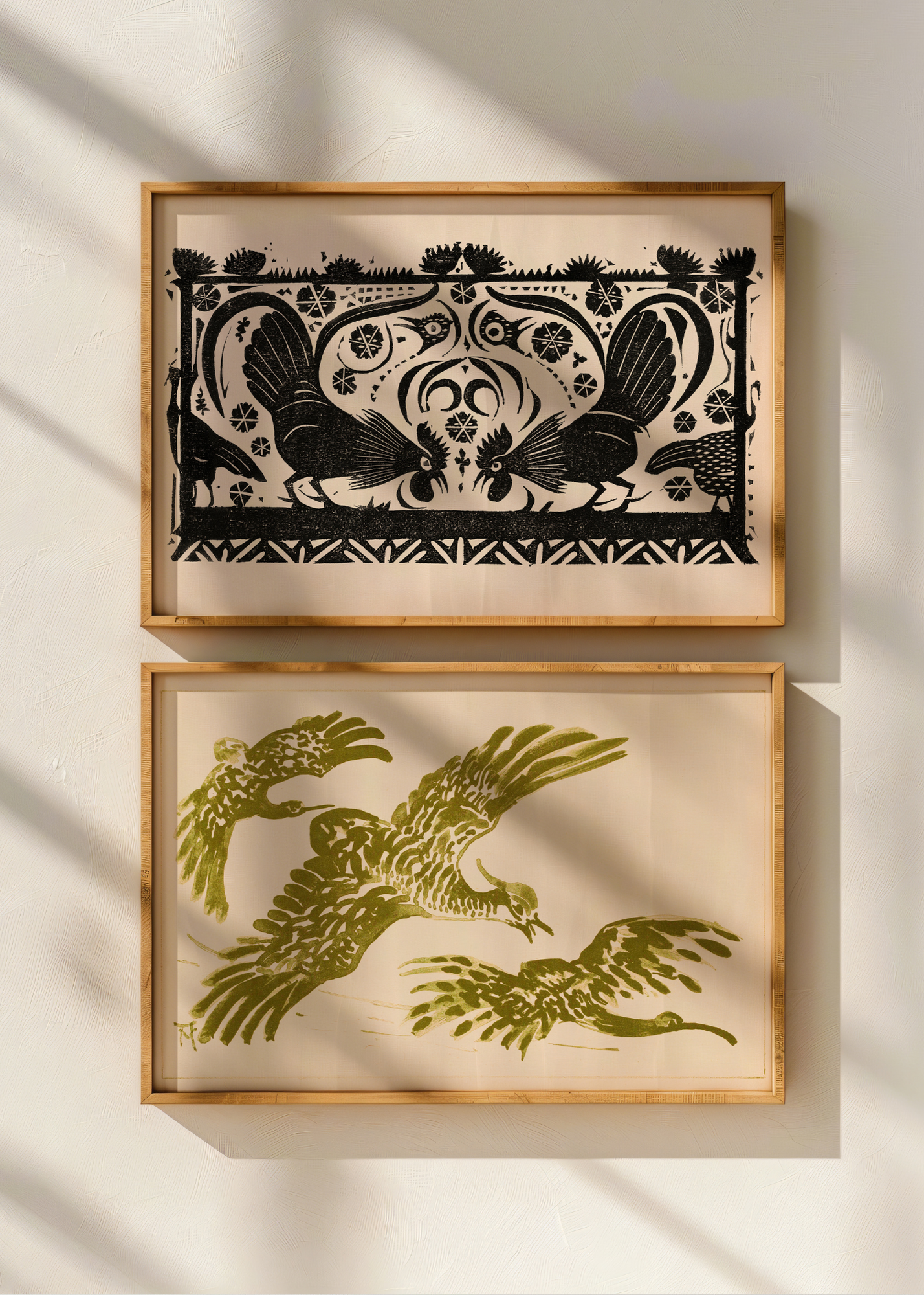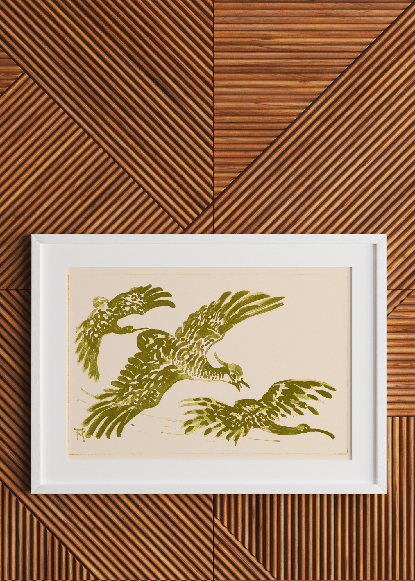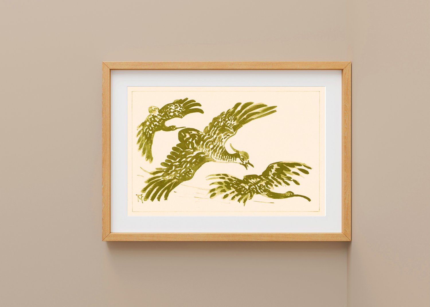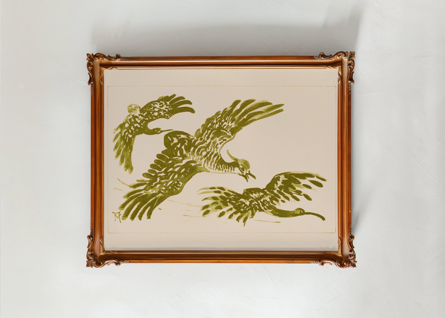 Three Flying Birds— Three birds rise in quiet formation, their wings caught mid-motion against an unseen sky. In Three Flying Birds, Theo van Hoytema offers a moment of weightless grace—each figure drawn with gentle economy, each stroke filled with reverence for the natural world. There is harmony in their flight, a hush between wingbeats, a feeling of drifting not just through air, but through stillness itself. It is a portrait of freedom, fleeting and tender, rendered with calm precision and quiet wonder.