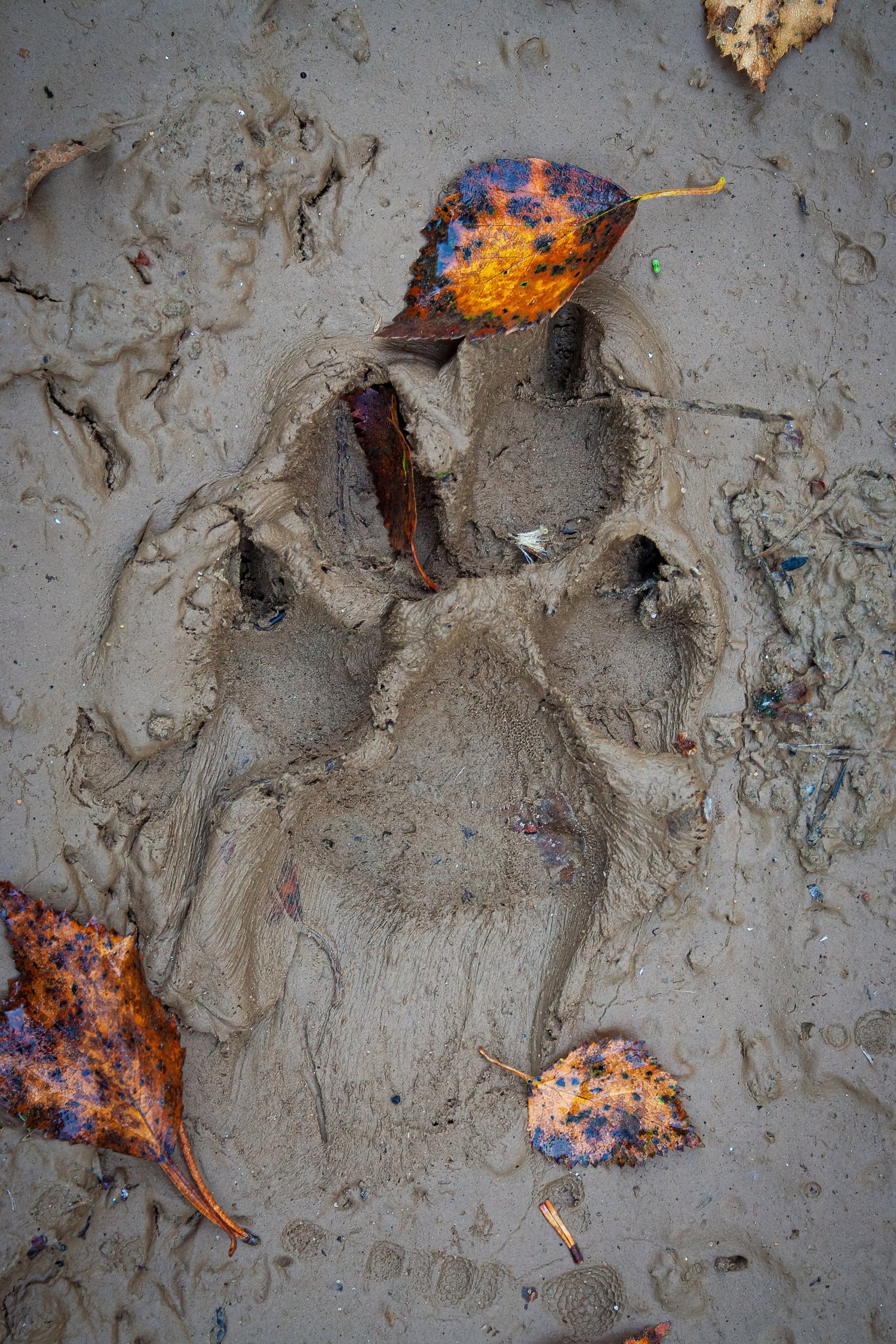 The wolf's left hind paw print on the side of the road. The wet clay has been a bit slippery and the paws have slipped.