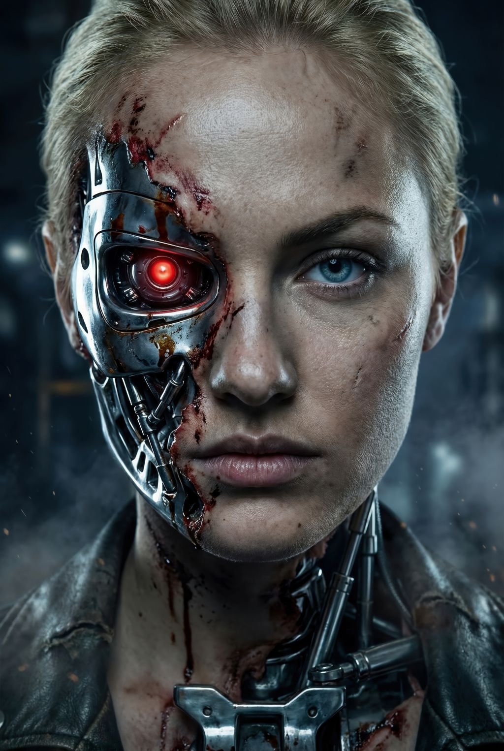 I’m staring straight through you with one human eye, one red warning light—half bruised flesh, half exposed machine. It’s that exact moment where you realize: the disguise is over, and whatever comes next can’t be stopped.