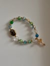 This enchanting one-decade rosary bracelet captures the serene beauty of the sea with stunning crackle glass beads in shades of emerald, aqua, turquoise, and crystal clear. Handcrafted with devotion and accented with gold-tone details, it brings prayer and protection to your everyday moments—whether you're at work, running errands, or simply need a reminder of faith close at hand.