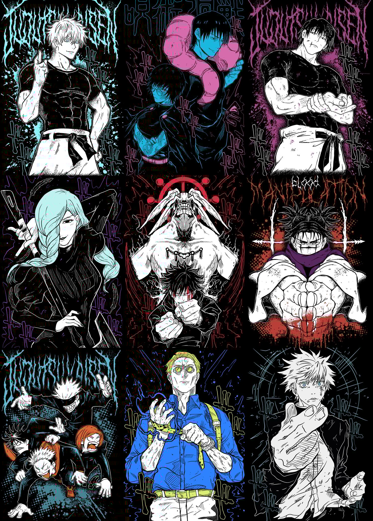 Diseño digital en alta resolución, inspirado en la fuerza, el estilo y la oscuridad de los personajes más icónicos de Jujutsu Kaisen: Gojo, Toji, MeiMei, Megumi, Choso, Nanami.