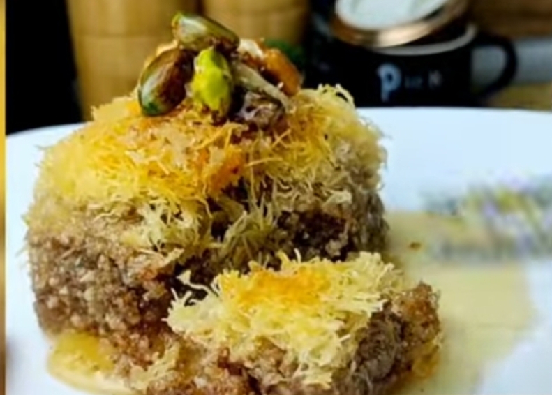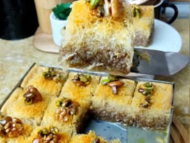 This recipe features handmade, thin dough layers generously brushed with melted butter, filled with a rich roasted peanut and coconut mixture, topped with fragrant kataifi infused with orange blossom water.