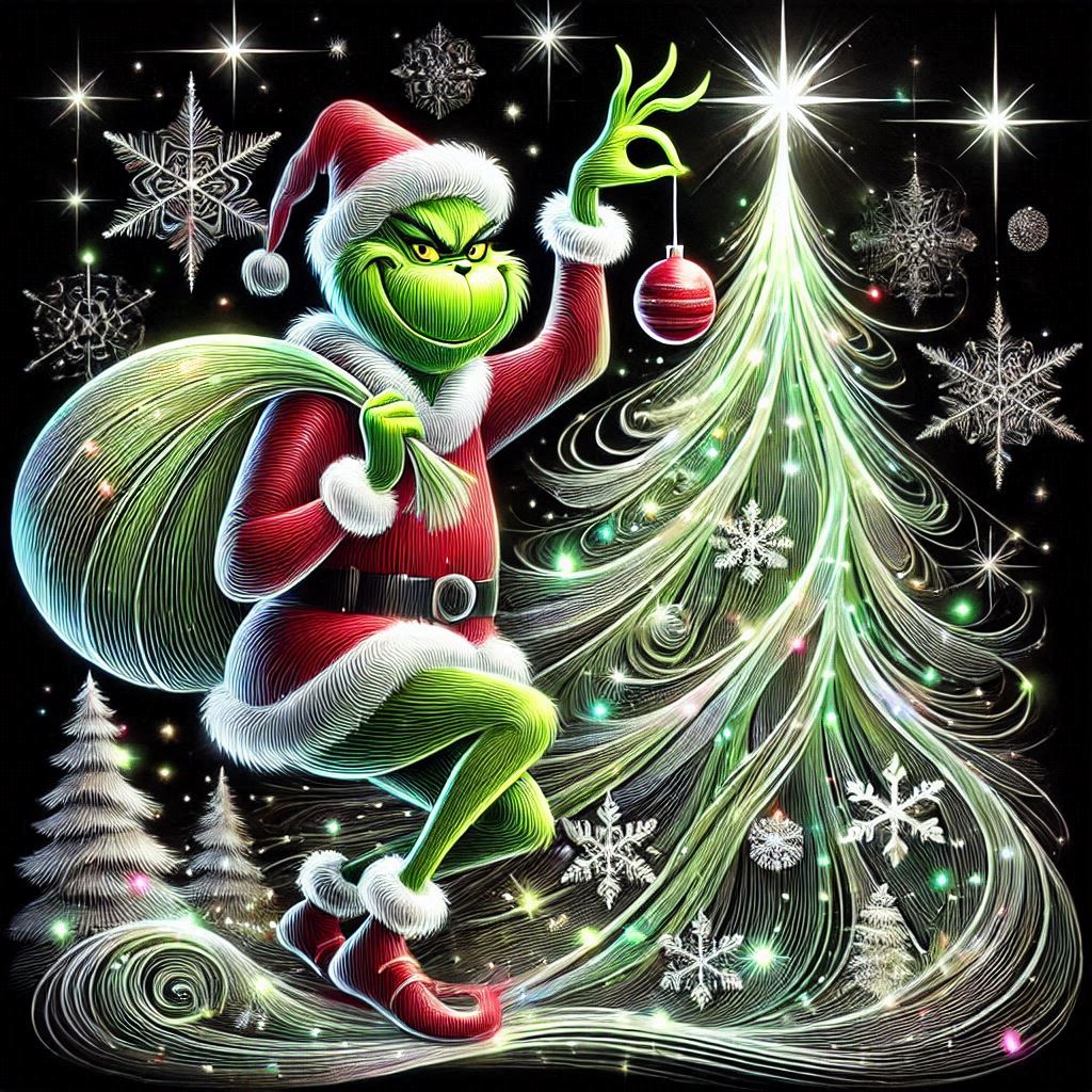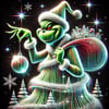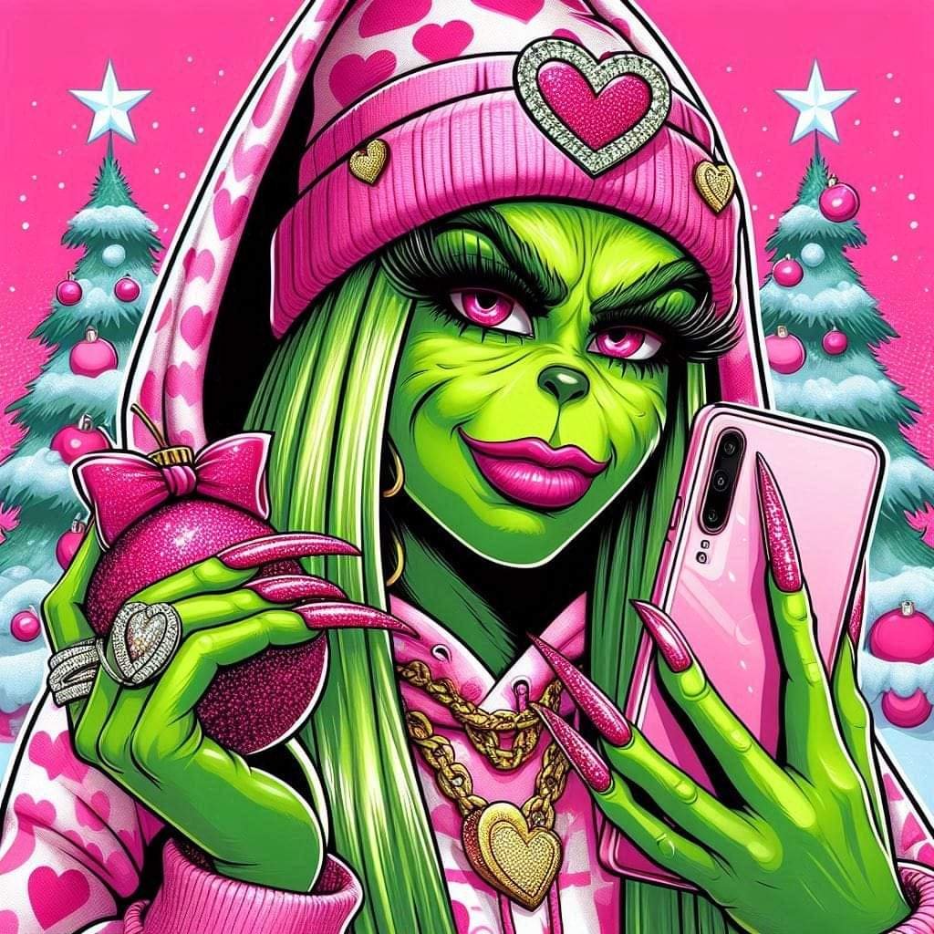 Girly Grinch with Coffee: A glamorous twist on the classic Grinch, complete with a glittery pink outfit, oversized lashes, and a holiday coffee cup. Perfect for fun, fashionable holiday designs that pop on any platform.