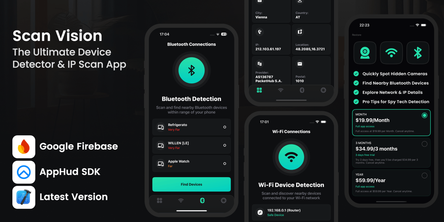 Step into the growing privacy and security market with Scan Vision, a powerful iOS app designed to help users detect hidden cameras, scan nearby Wi-Fi and Bluetooth devices, and view detailed IP information. Built with Swift and UIKit, this fully developed iOS source code offers everything you need to launch a professional-grade privacy toolkit with real-world utility.