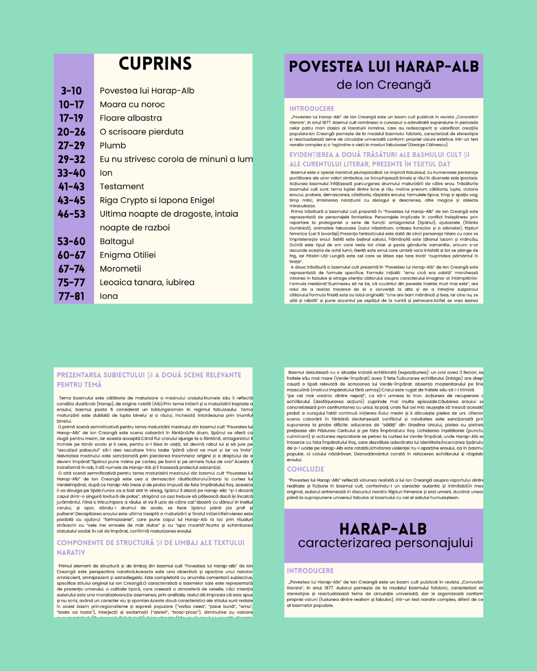 - eseurile complete pentru punctaj maxim de la Povestea lui Harap-Aln până la Iona, cu toate cele 3 tipuri de eseu (viziunea despre lume, caracterizare personaj, relația dintre personaje)