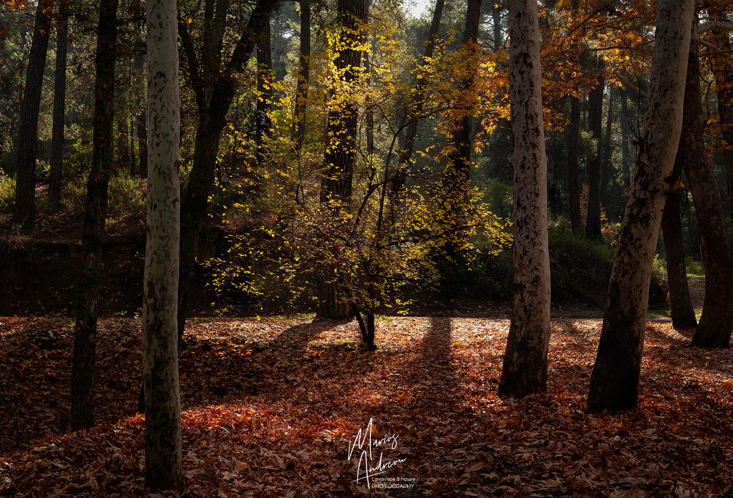 A golden light pierces the forest canopy, illuminating a path of fallen autumn leaves and a single, vibrant tree. This photograph, 'Forest Light,' captures a magical moment in the Platania forest where the sun's rays create a breathtaking interplay of light and shadow. The rich, warm tones of the forest floor contrast with the towering trunks of the plane trees, creating a scene of both intimate detail and grand scale. This piece is a perfect window to the peace and quiet beauty of a sun-drenched autumn day.