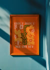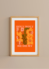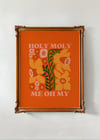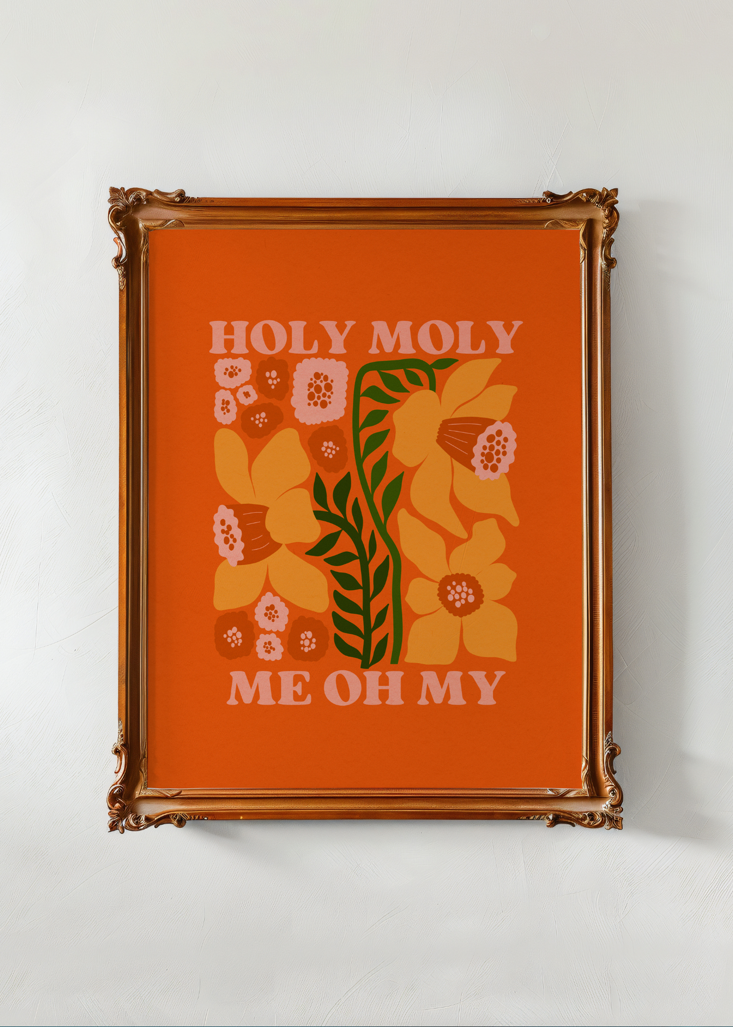 Holy Moly— Joyful and full of soul, this print has a rich orange background and a dreamy floral bouquet in golden yellow and burnt orange. In fun, flowing text, it exclaims: “Holy moly me oh my.” It feels like a favorite song lyric, a good hair day, and fresh cookies on a Sunday morning all rolled into one.