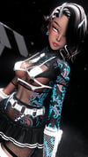 ♡ Bra, Panties, Skirt, Fishnet Top, Fishnet Bottoms, Tie, Belt, Leg Strap, Gloves, Shoes, Horns, Face Piercings, Horns, Elf Ears/Human Ears and 3 Hairs ♡