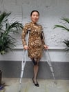Gigi: Sak Amputee Girl, wearing leopard print stockings and using crutches.