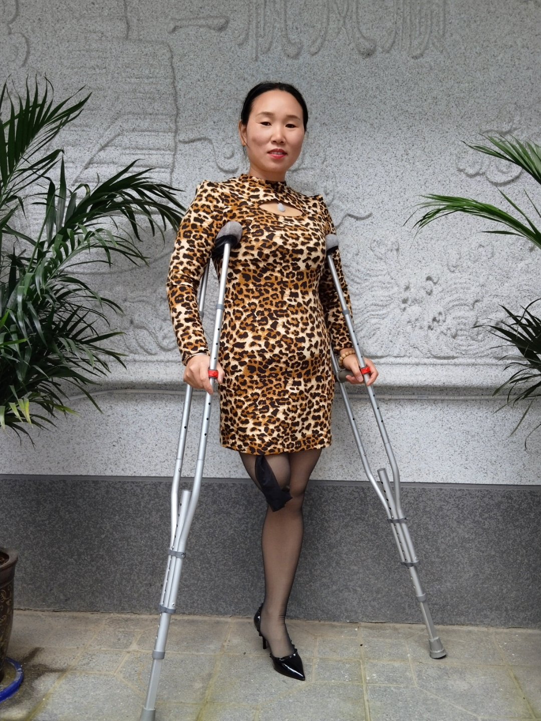 Gigi looked incredibly sexy and glamorous today. She was wearing a leopard-print long dress, black stockings on her remaining leg, and a single black high-heeled shoe. She was using crutches, but still confidently showcasing her beautiful figure.