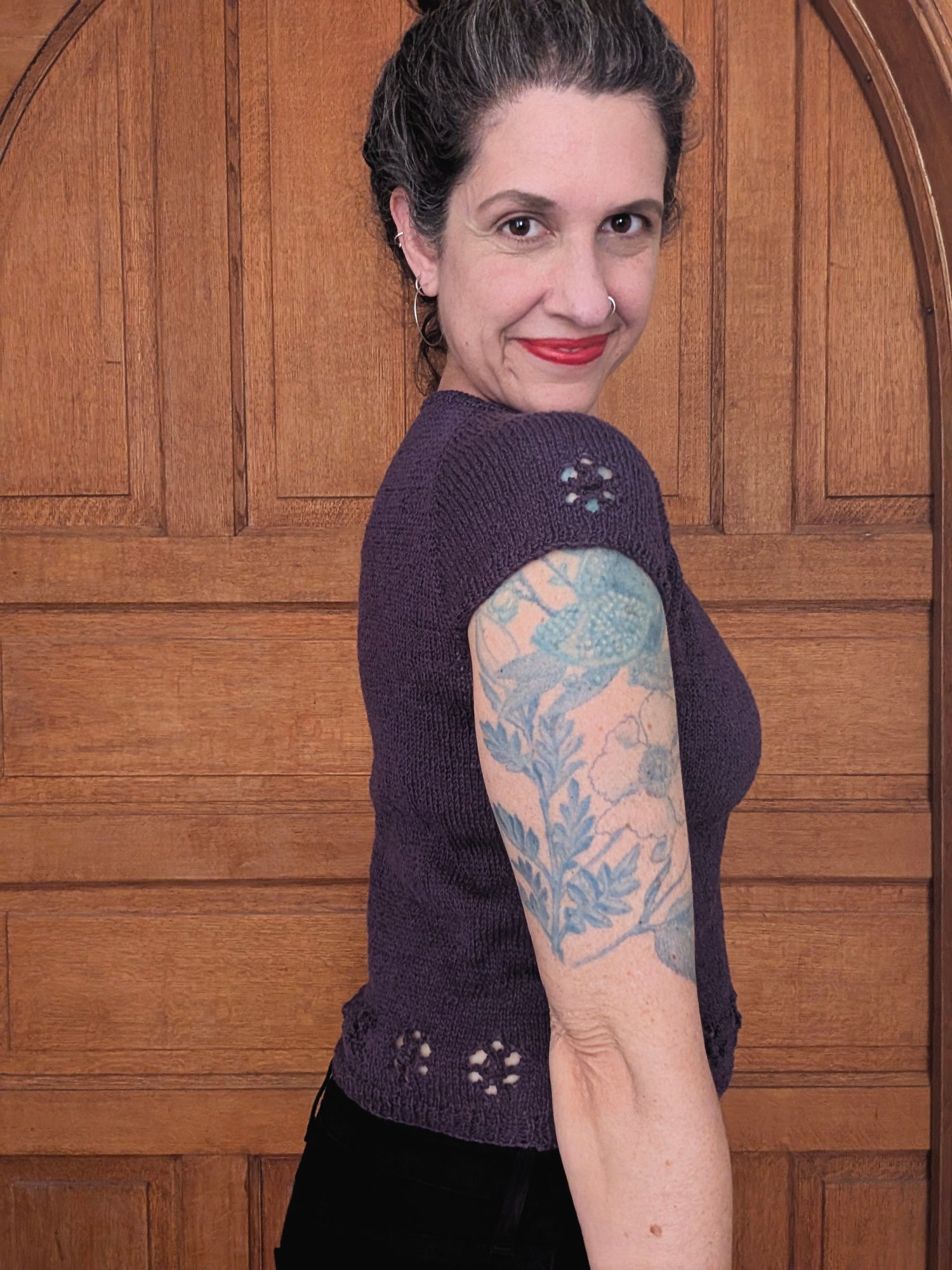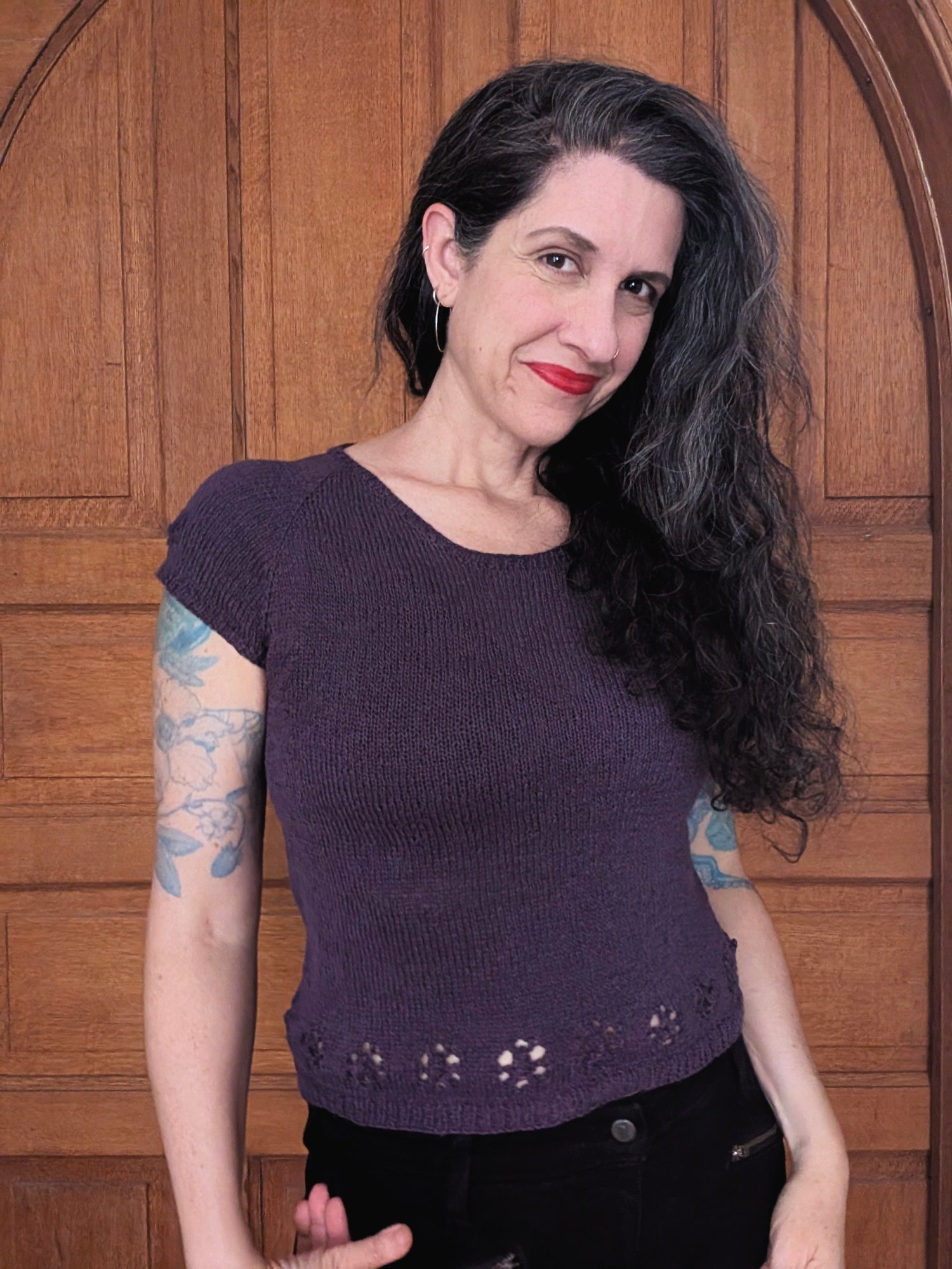 Daisy Chain is a delicate, lightweight summer tee with a lacy flower pattern around the bottom hem. It has a seamless, top-down construction with raglan shaping, so you can try it on as you go to make sure you get a perfect fit!
