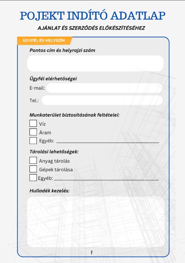 - 📋 Projekt indító és Ügyfél adatlap: Rögzíts minden kritikus infót (HRSZ, közműórák, felelősök) már az első napon!