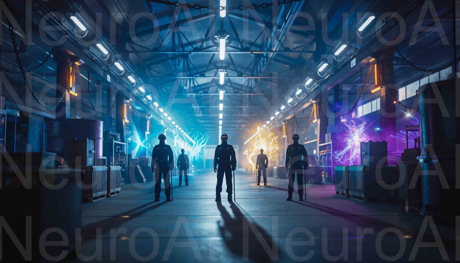 Workers oversee energy in a futuristic factory