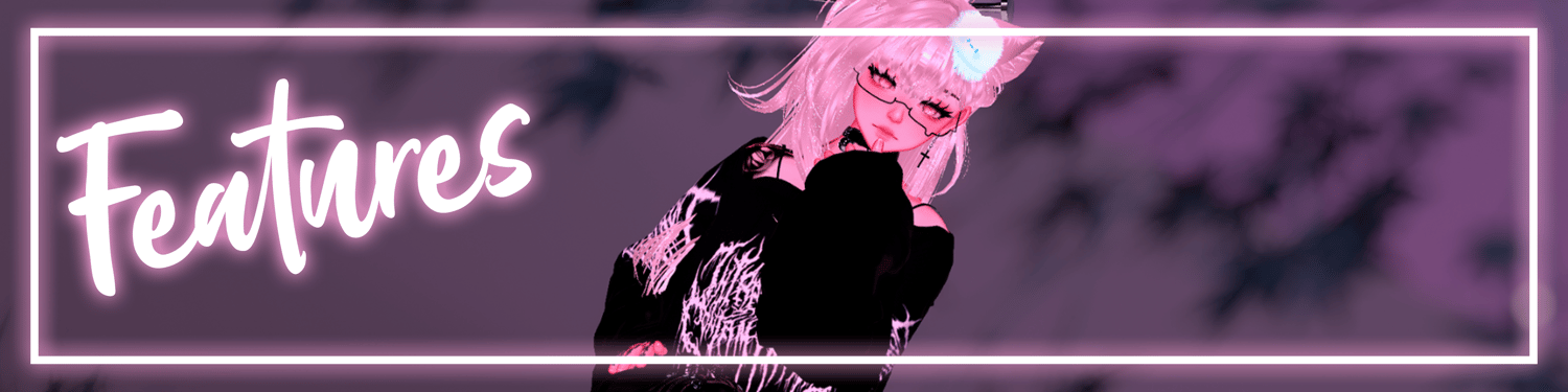 PC: Hair Swap (2 hairs), Sweater, Dress, boots, Undies (NSFW Only), Glasses, Earring, Collar, Bandage, Ears, Tail, Flow Toy L/R, Jelly Blob, Lobster, Pool (World Drop), Pool Hue, Tail Wag, Ear Twitch, Blinking, Boop, Headpat, Skintone Slider, Hair Mat Swap, Eye Mat Swap, Tattoo Shine, Undie Mat Swap, Collar Mat Swap, Boots Mat Swap, Sweater Mat Swap, Hair Emission, Eye Emission, Tattoo Emission, Eye Hue, Tattoo Hue, Collar Hue, Boot Hue, Sweater Hue, Jelly Hue, Lobster Hue.