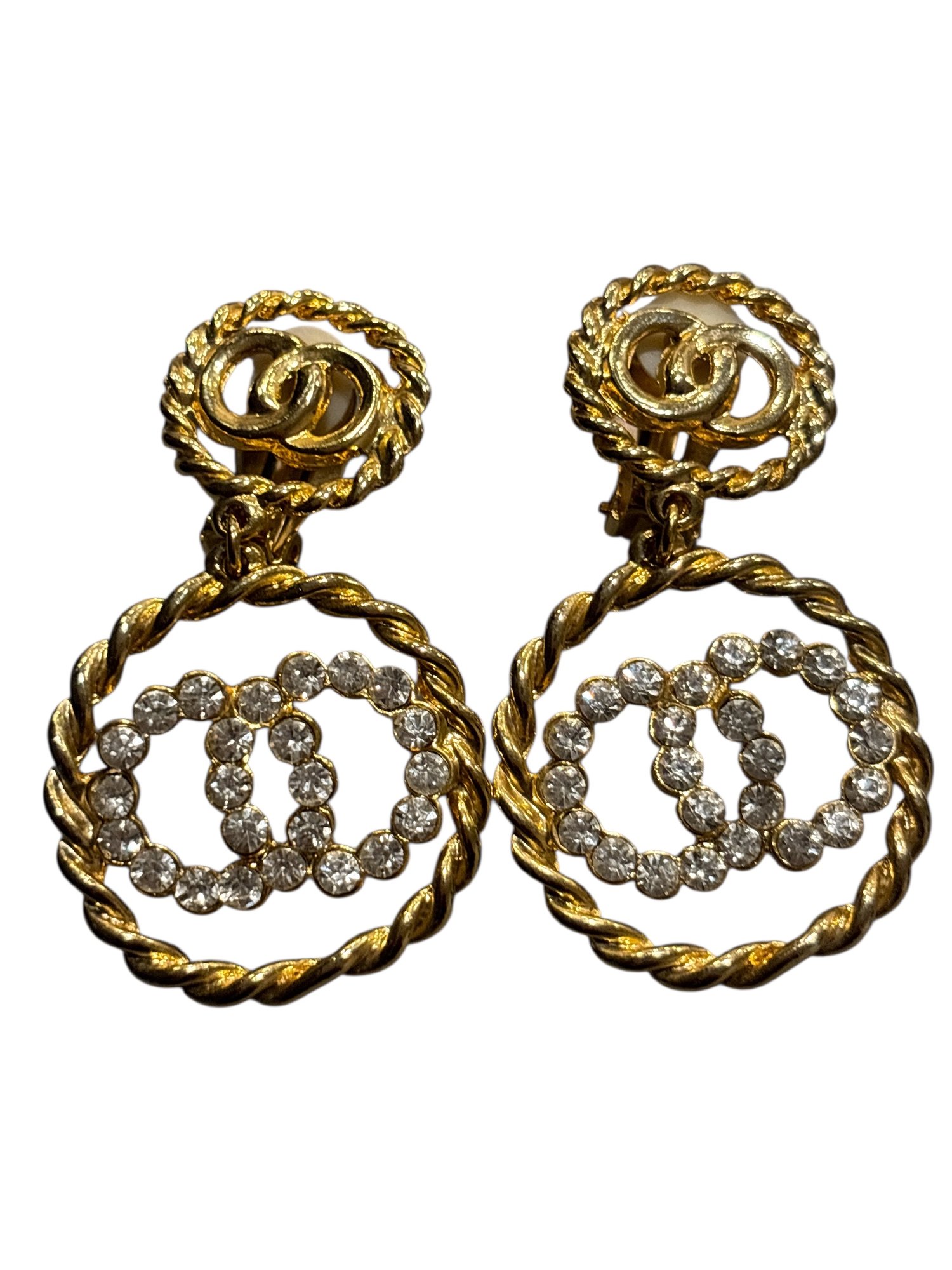 Elegant and eye-catching, these gold-tone clip-on earrings feature a timeless circular design accented with sparkling clear crystals. The textured rope-style frame adds dimension and polish, while the crystal-set center creates a refined, statement look.