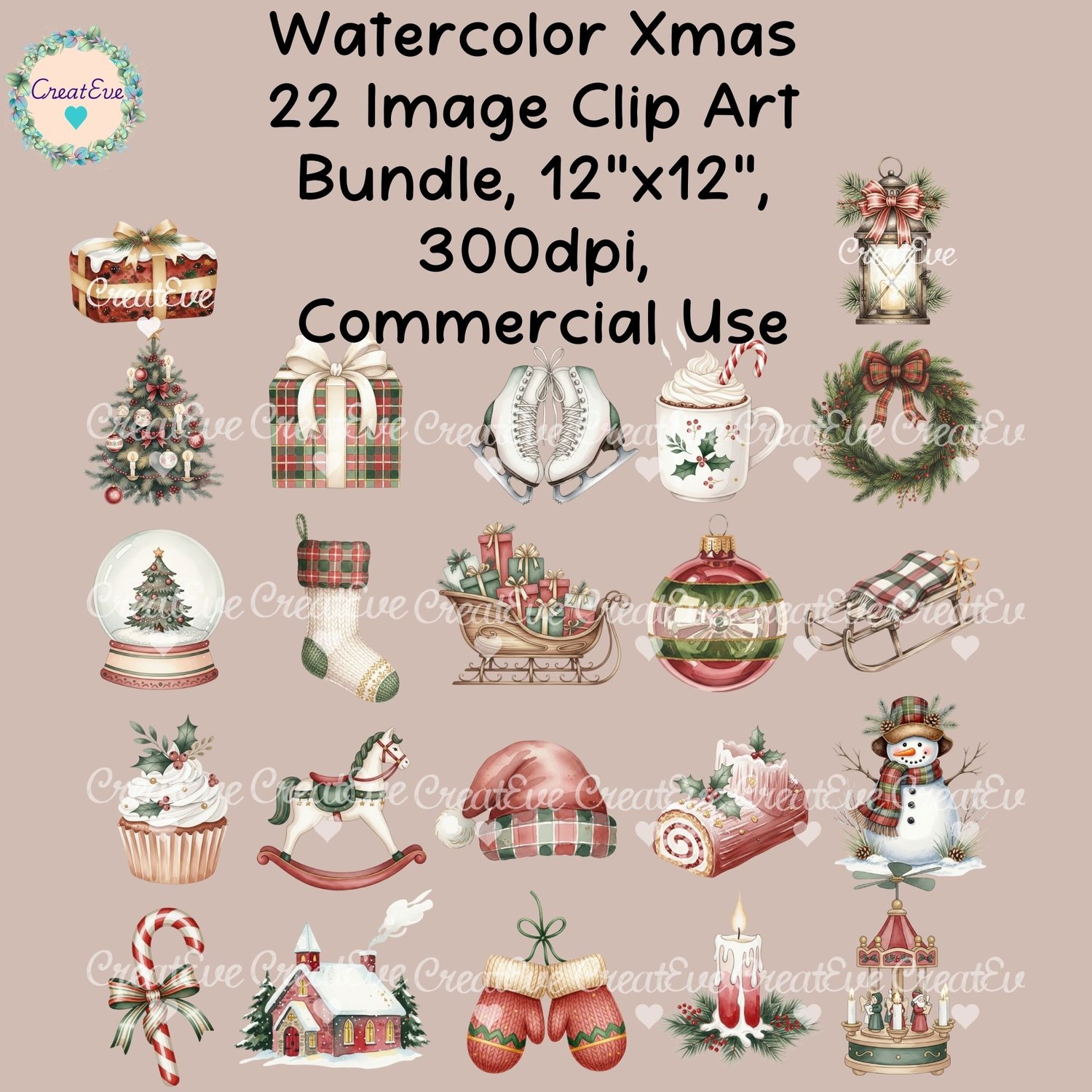 Watercolor Xmas 22 Image Clip Art PNG Bundle, 300dpi, 12" x 12"