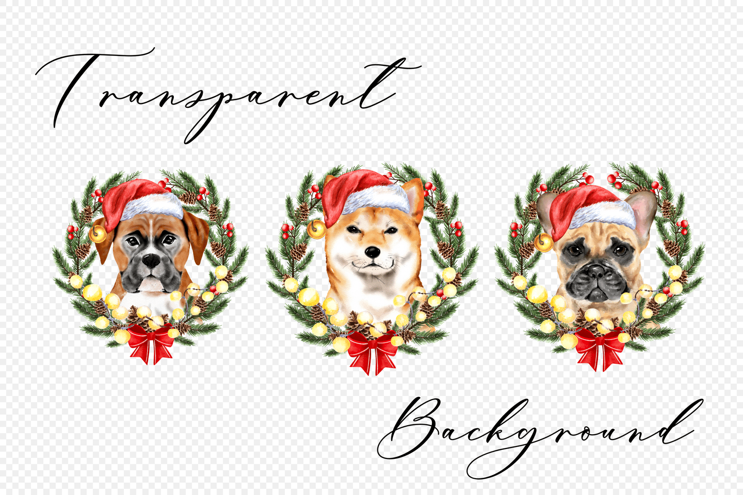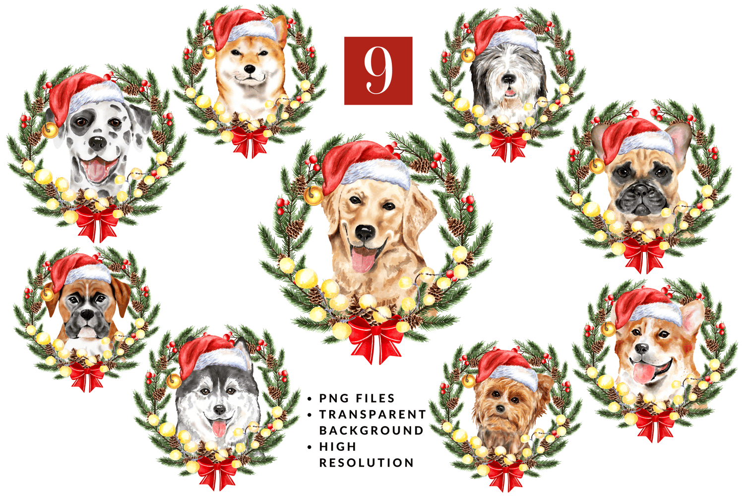 – 9 PNG Files of Cute Watercolor Christmas Dog Cliparts. Portraits of a Golden Retriever, a Siberian Huskey, a Dalmatian, a French Bulldog, a Welsh Corgi, a Shiba Inu, a Boxer, a Yorkshire Terrier & a Bearded Collie.
