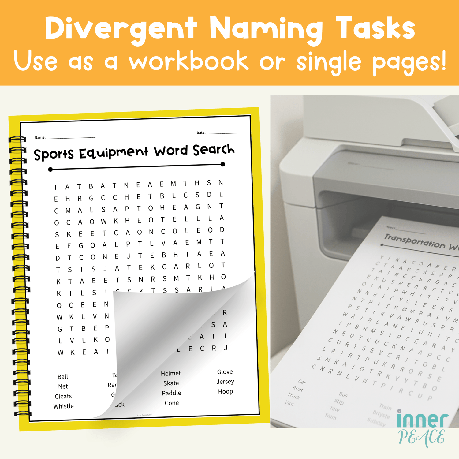 Make language learning fun with these engaging Divergent Naming Word Searches! Each themed puzzle helps students build vocabulary, strengthen category knowledge, and practice divergent naming skills through a hands-on word search activity.