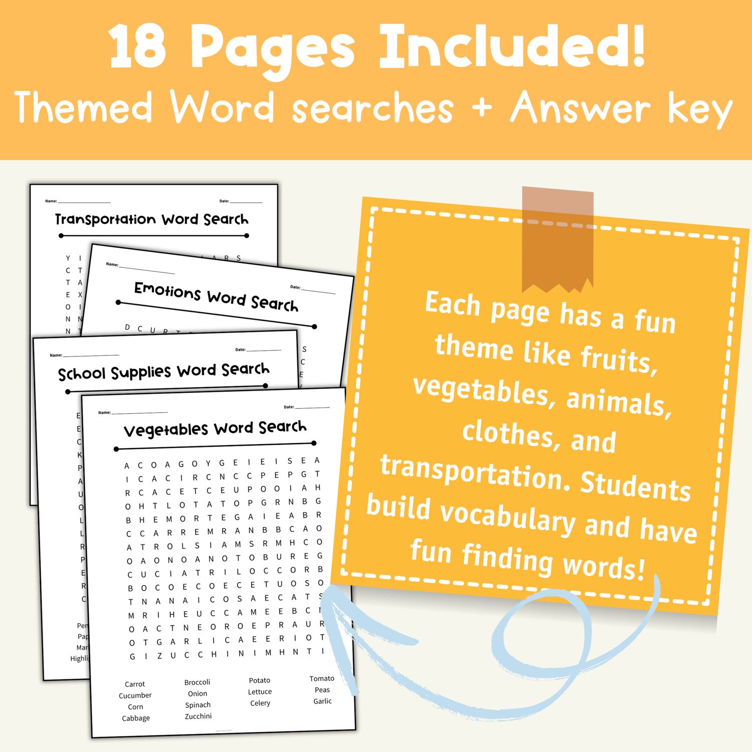 - 09 themed word searches: Fruits, Vegetables, Animals, Winter Clothes, School Supplies, Sports Equipment, Ocean Animals, Emotions, and more!