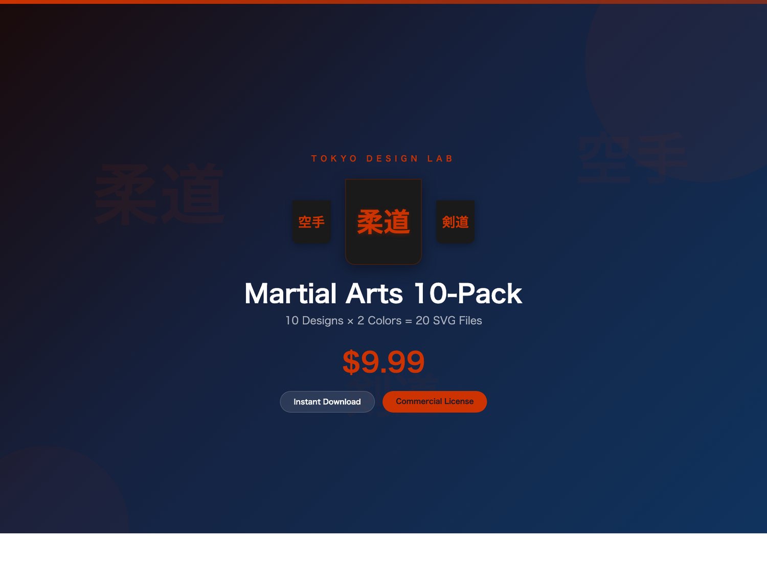 10 powerful Japanese martial arts and Budo spirit designs, each in 2 color variants = 20 SVG files total.