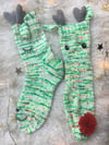 Inspired by my love of crazy Christmas sweaters, I wanted to design a crazy pair of Christmas socks! This pair of top down socks certainly qualifies. You start by knitting the ears and the antlers and join those to the sock when casting on the cuff. After the ribbed cuff it’s smooth sailing with a vanilla sock. When your socks are finished you can embroider on a face or add a pompom nose!