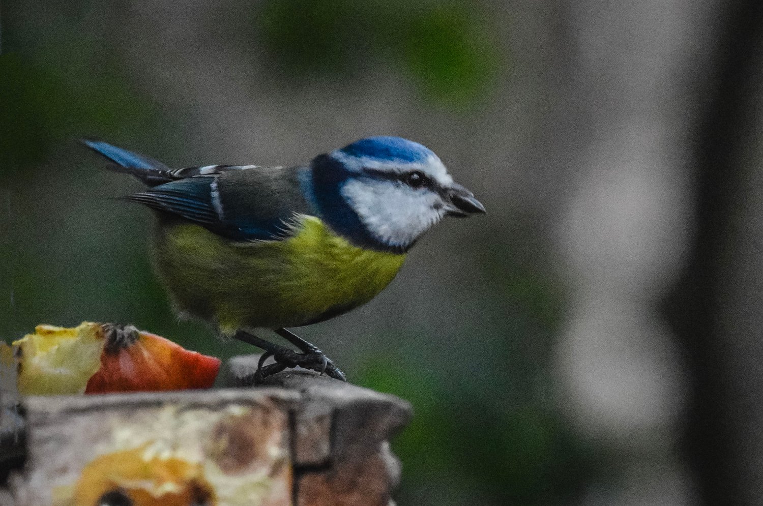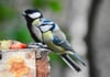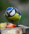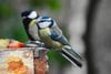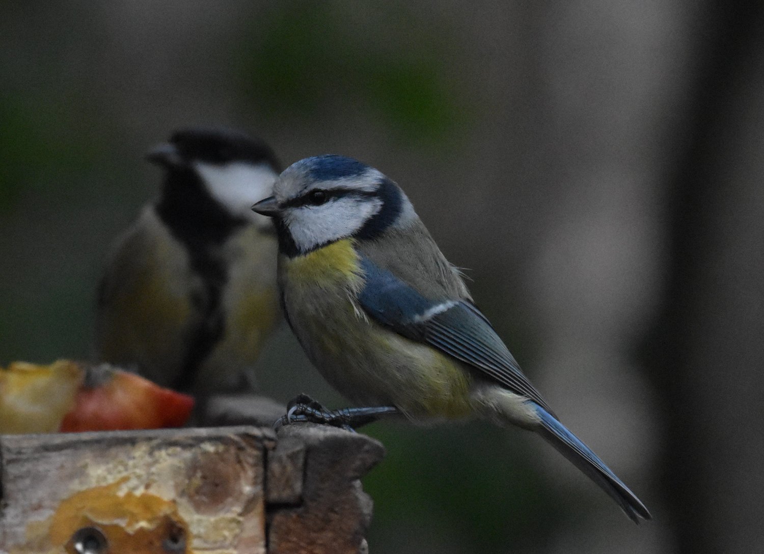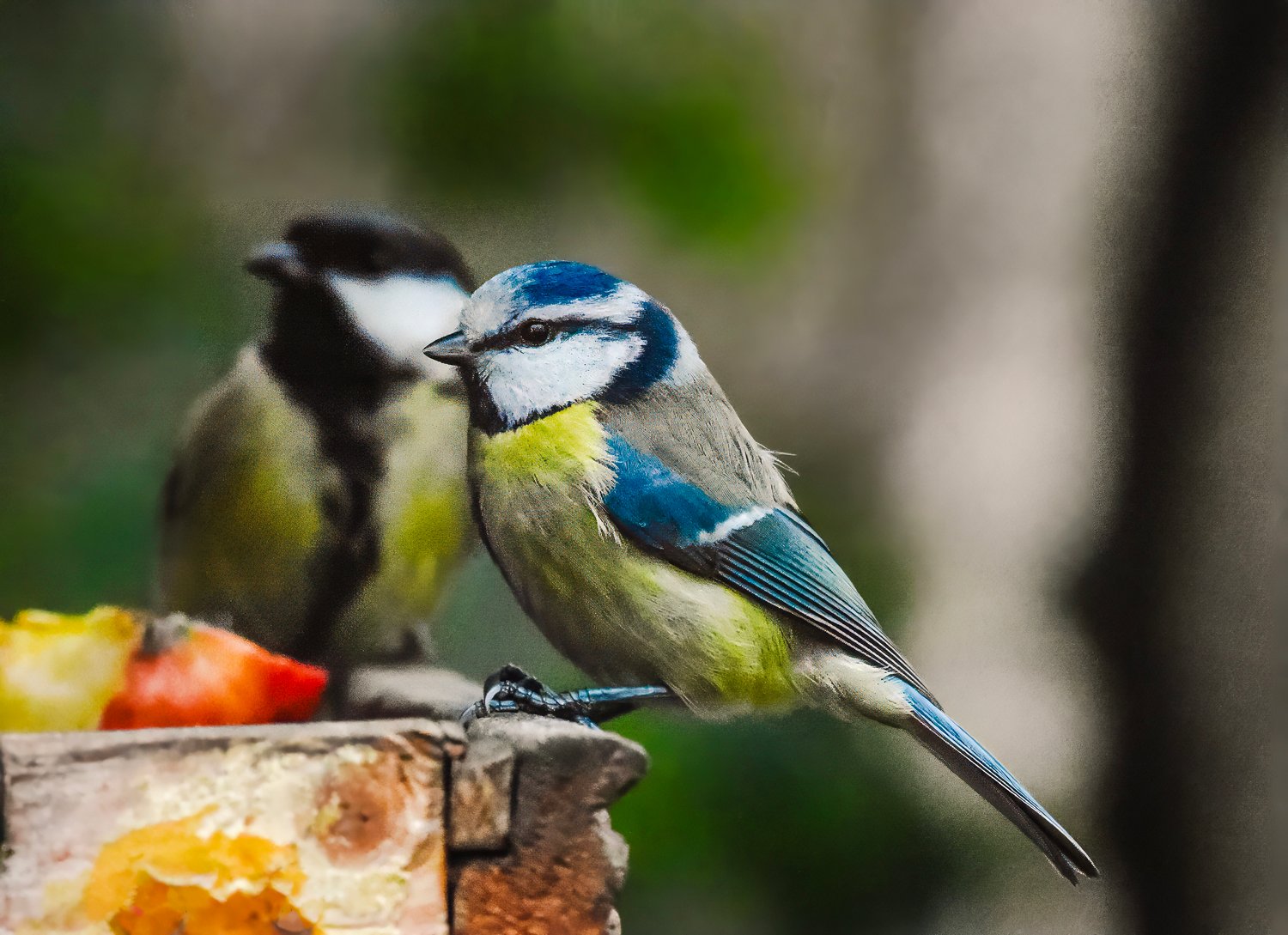 blue tit, great tit, garden birds, winter birds, fruit feeding, bird feeder, small birds, backyard wildlife, nature photography, birdwatching, colorful plumage, Eurasian birds, perched birds, outdoor scene, natural light, wildlife close-up, bird behavior, seasonal birds, wooden surface, bird interaction, European songbirds