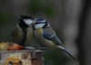 Two small garden birds, a blue tit and a great tit, perched near fruit pieces on a wooden surface in winter light.
