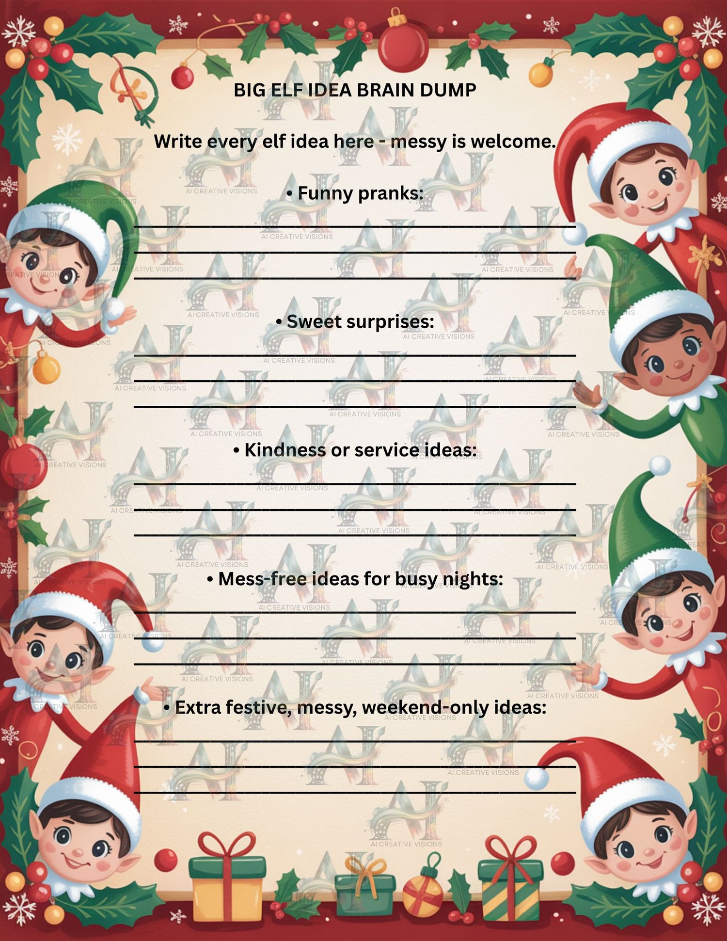 This purchase includes the full, professionally designed 9-page printable Elf Scene Planner template with Private Label Rights (PLR).