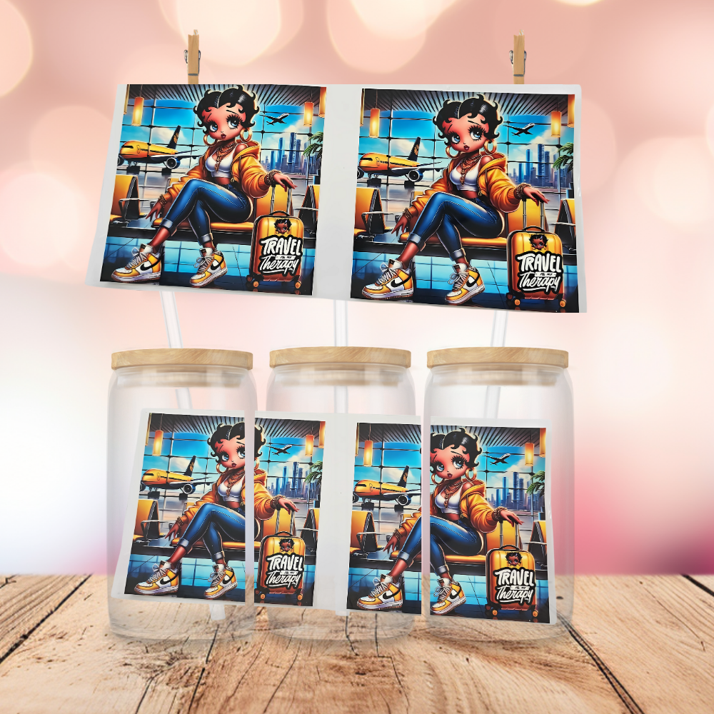 For the stylish soul who knows that a good trip fixes everything, the Miss B Travel Therapy Wrap is the perfect vibe! Featuring Miss B in her jet-setter look, tumbler in hand and ready to explore the world, this wrap is made to fit 16 oz Libbey glass cups or tumblers and adds a touch of glam to every adventure.