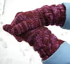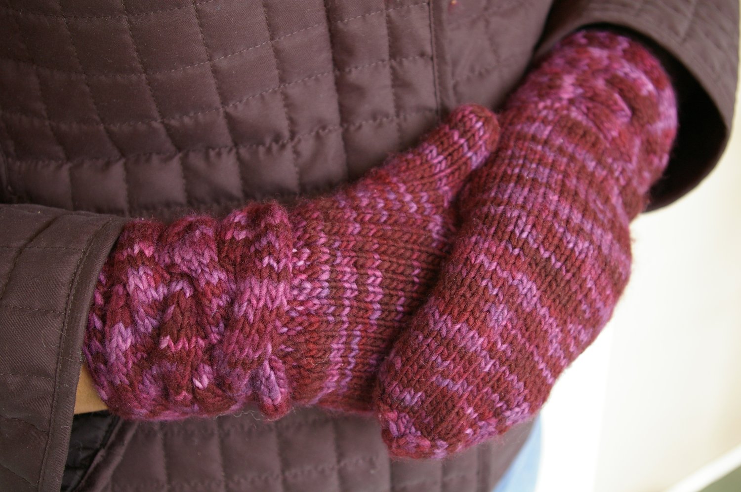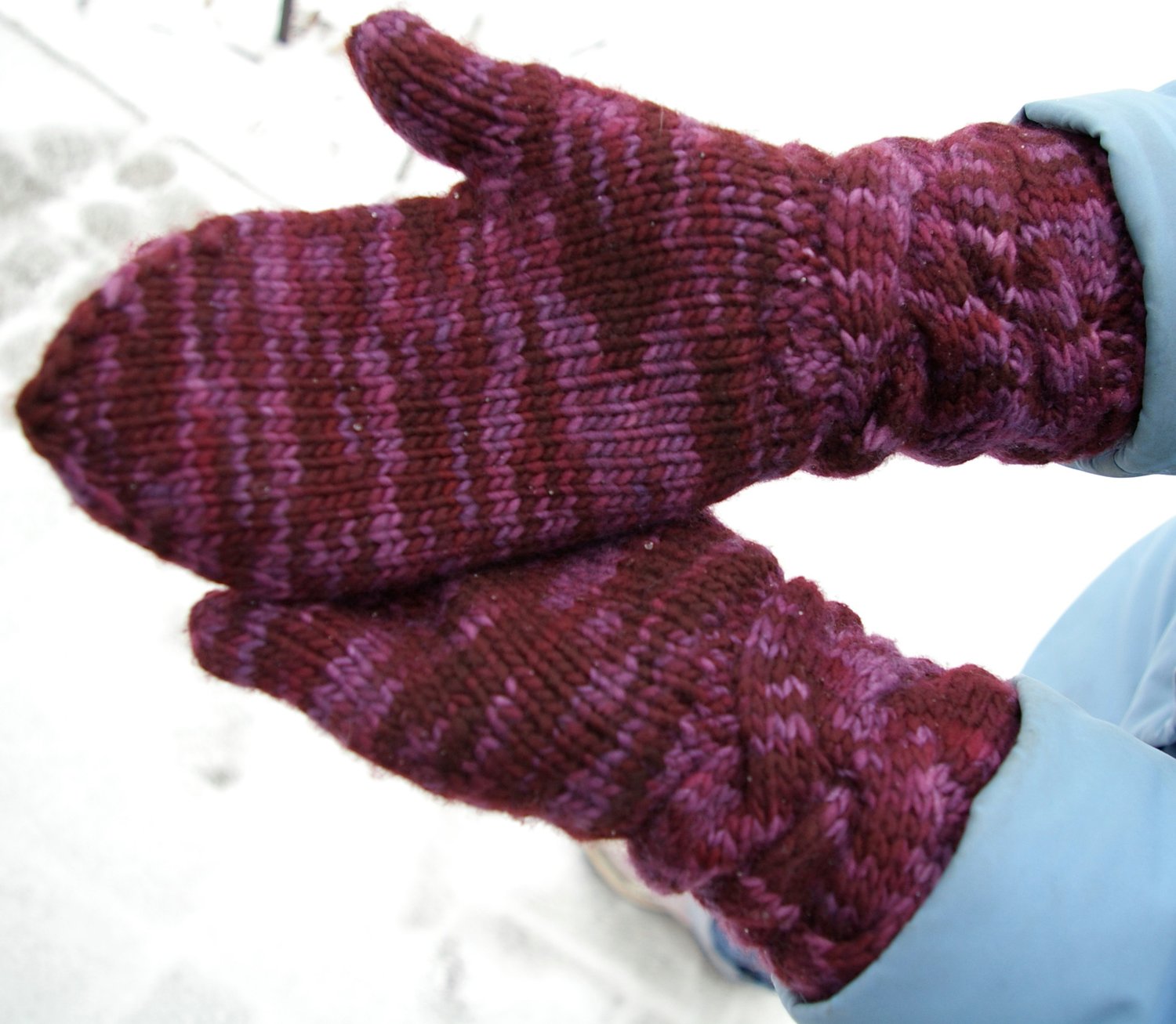 The Payden hat and mittens set is designed for knitters who love cabling but aren’t quite in the mood for cables AND shaping at the same time. In this set, the hat’s brim and the mittens’ cuffs are first knit flat with a bulky cable motif, then sewn into a band. Stitches for the crown and hand are picked up from the selvedge of this cabled band and knit in the round. The hat and mittens are both decreased along two sides instead of in a circle; this allows the mittens to fit more comfortably on the hand and the hat to lay flat (as well as to mimic the mittens). Instructions for the mittens are mirrored so that the seam for the cuff lays under the wrist and the cables are mirrored.